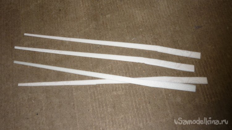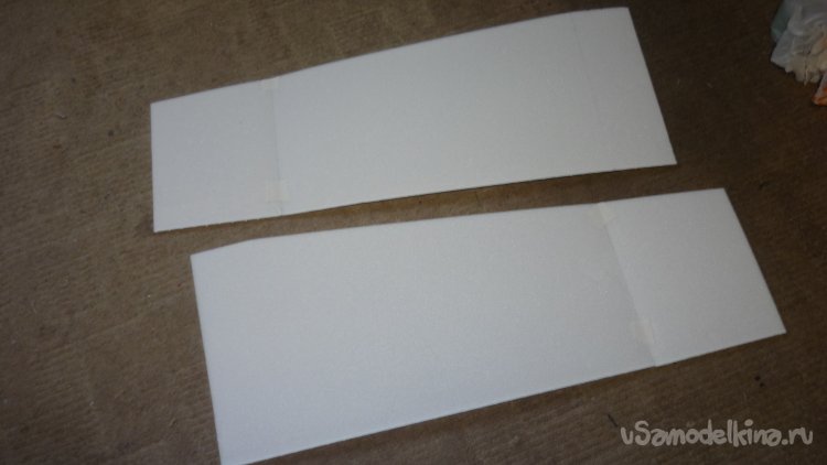 Полученные заготовки элеронов склеил в два слоя, срезал под угол переднюю кромку и навесил на бумажный, малярный скотч.