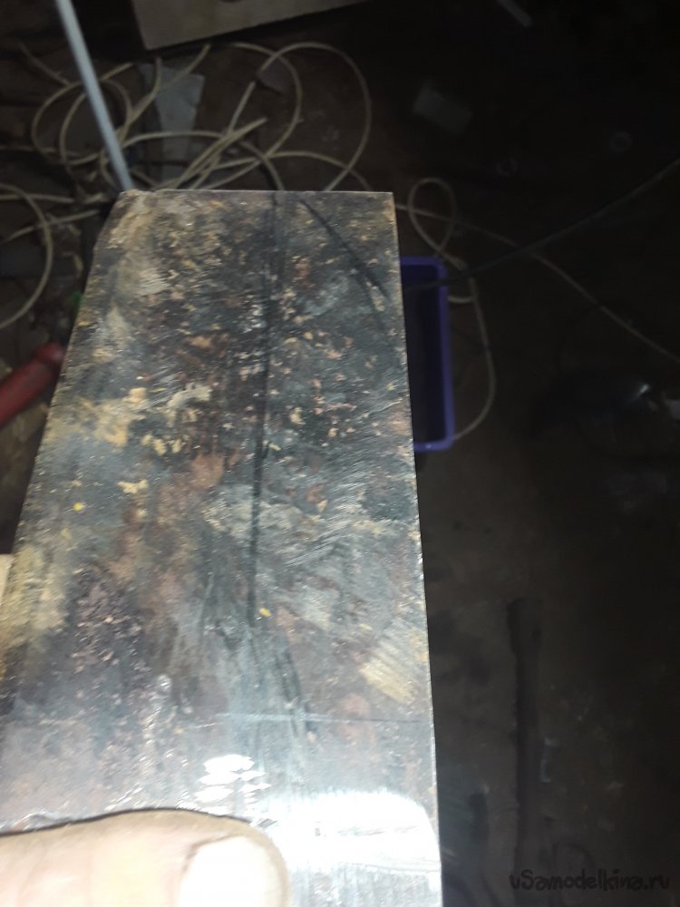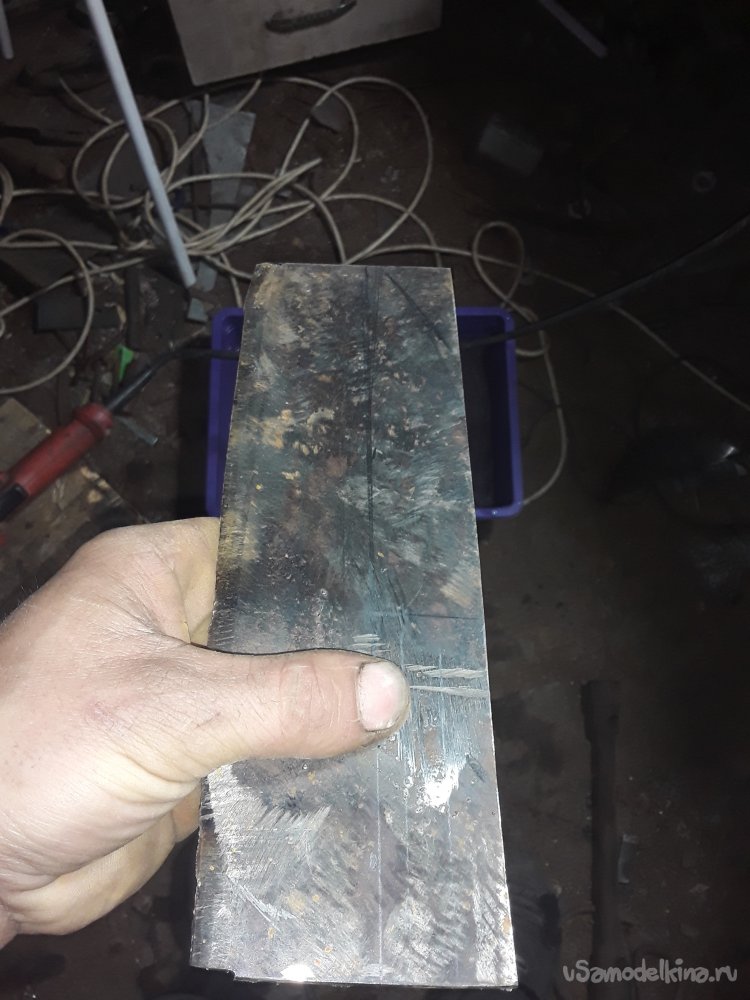 На куске металла отмечаю примерную форму клинка немного с запасом по 1мм. Сразу разметил длину хвостовика, ширину и приступил к распилу. Распил произвожу без усилий и по паре мм сразу остужаю водой так метал не испортится. После распила на грубом камне обрабатываю все лишнее доводя до точной формы, убираю все острые края.