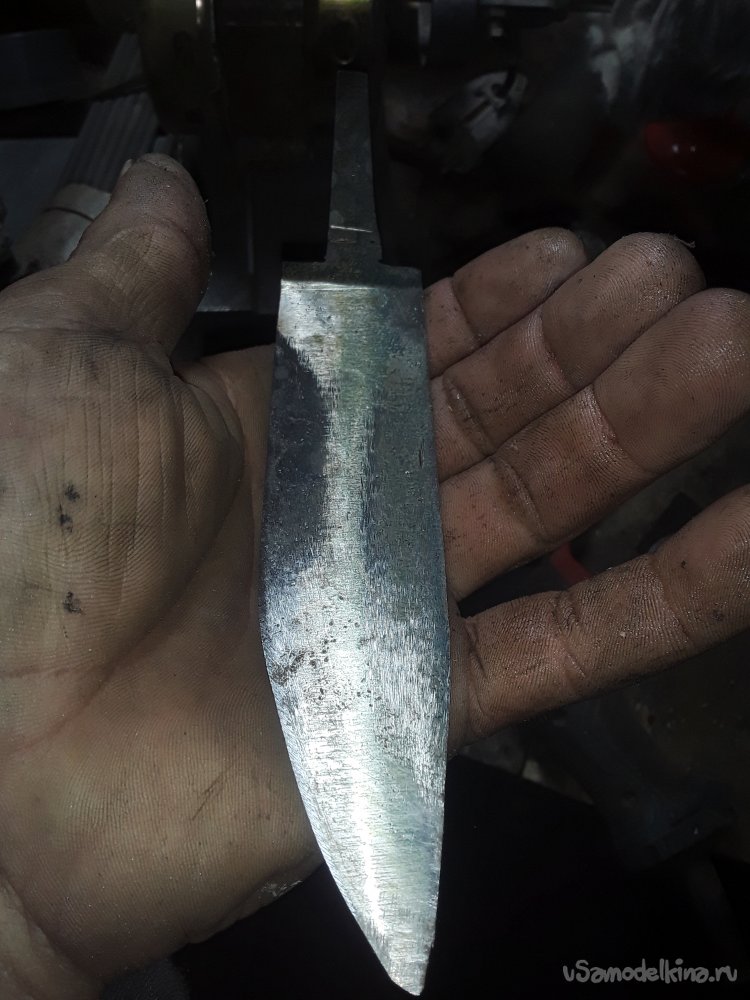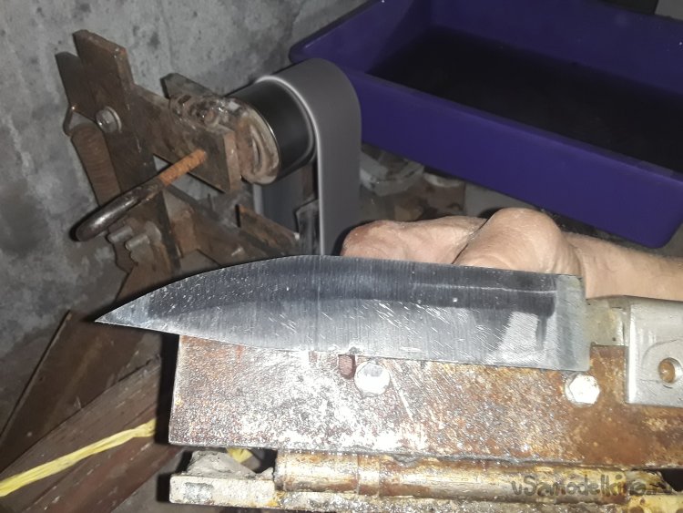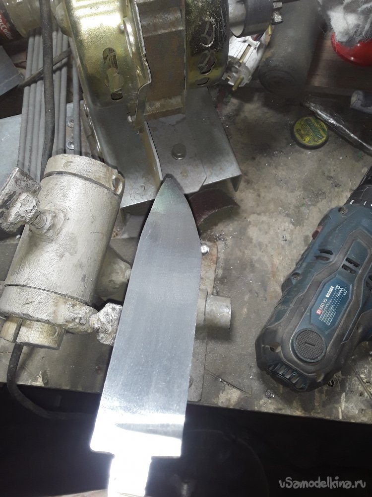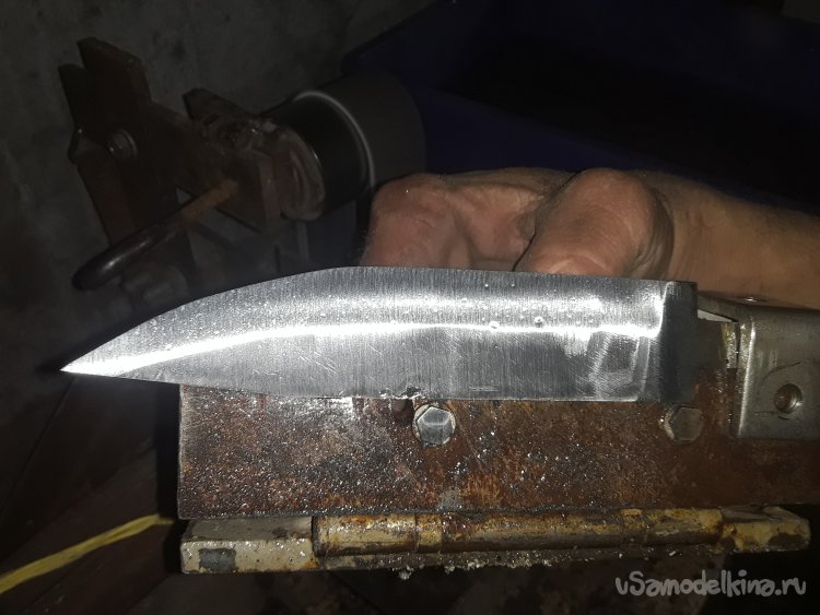Работая с острием на плоско шлифовальном станке формирую толщину 2мм. Далее на наждаке с грубой лентой формирую клин с помощью приспособления бульдозер. На каждую сторону у меня ушло по две ленты на 80ед. И две 100ед. Метал не очень хорошо шлифуется, ленту съедает очень быстро самое главное при работе постоянно остужать.