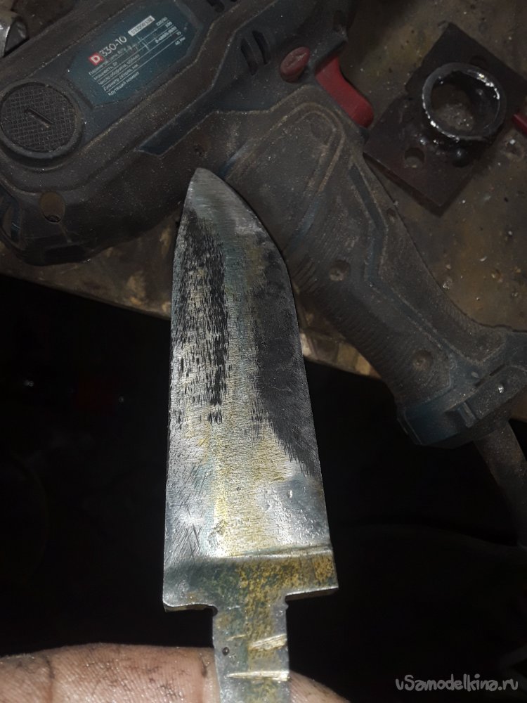 Здравствуйте уважаемые читатели и гости в сегодняшней статье как всегда речь пойдет об изготовлении ножа из мех.пилы. Есть полотна для распила дерева она немного послабее чем р18, но тоже крепкая. Бывает нужно просверлить пару отверстий в заготовке, но простым сверлом это невозможно. Есть специальные сверла для такой стали, но они дорогие и не всегда качественные. Я, для того чтобы просверлить беру сверло по бетону с напайкой немного затачиваю его и с легкостью сверлю. Метал на этом полотне судя по надписи выбитой на краю пилы р18. Такая стать очень крепкая и рез держит хорошо ее используют для сверил, резцов и пил для распила железнодорожных рельс. Особо о составе стали рассказывать не буду, но в целом сталь прочная она хорошо режет, но есть и минусы. Самый существенным это то что отшлифовать его очень тяжело понадобится очень много бумаги и времени да и в зеркало отполировать еще то занятие. Так как в домашних условиях ее закалить не получится я решил аккуратно вырезать по контуру форму ножа и отшлифовать все лишнее. Самое главное очень часто остужать метал и резать понемногу иначе все будет испорчено. И так отрезаю кусок от пилы и иду рисовать форму клинка.