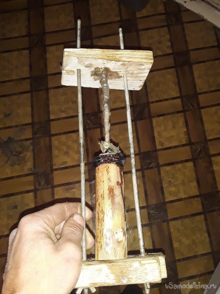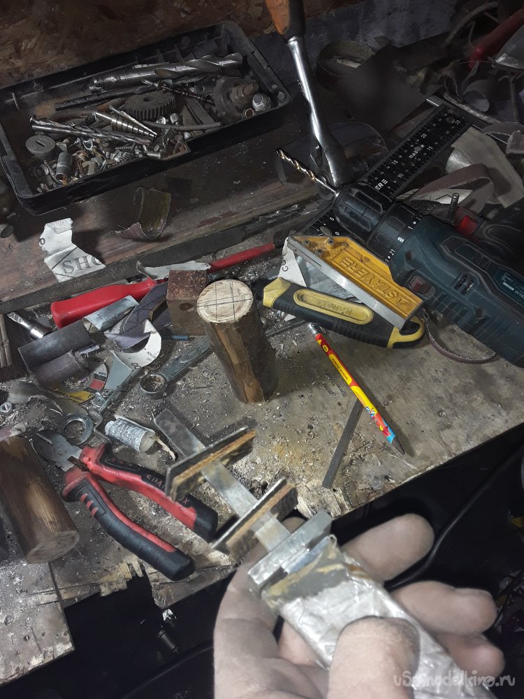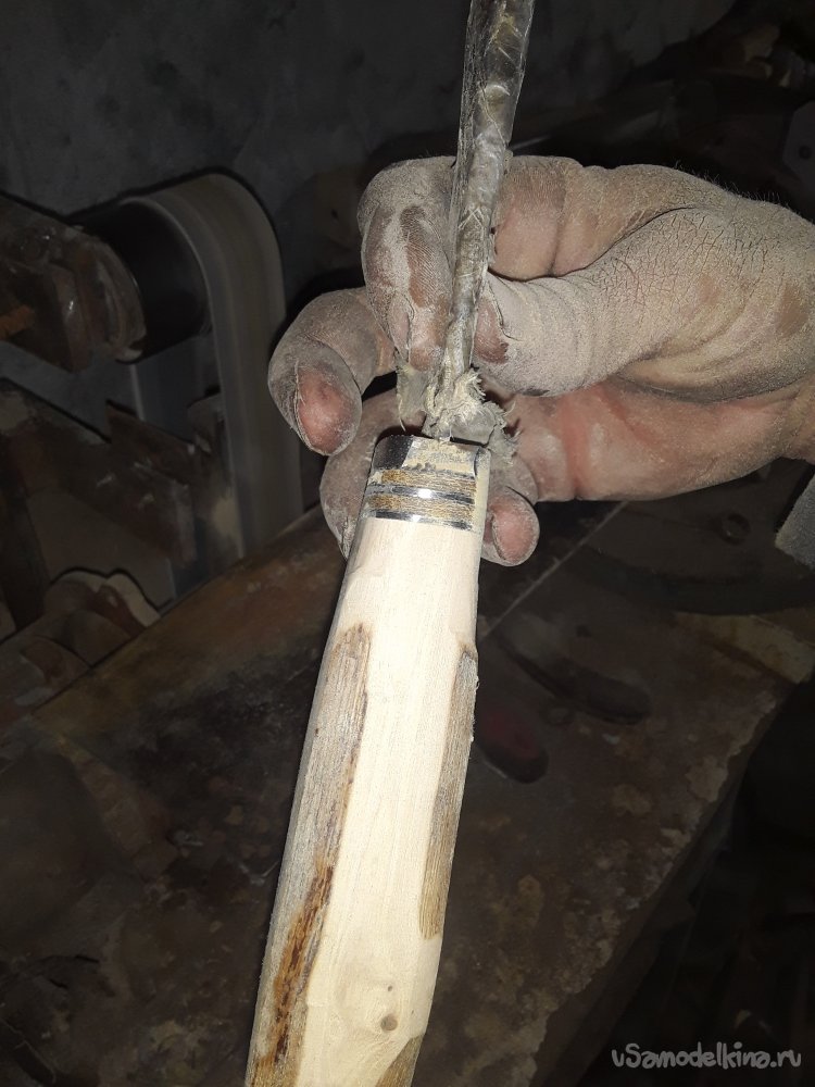 Ну вот и все осталось сделать больстер и собрать рукоять. Для упора отрезал кусок нержавейки 8мм. Чтобы упор прилегал плотно напильником выравниваю место прилегания и ширину. Делаю разметку на нержавейке и просверливаю сверлом 1мм, а со стороны рукояти просверливаю не до конца сверлом на 6мм. Далее набором надфилей расширяю до нужной формы под хвостовик немного с запасом. Потом зажимаю клинок в тиски через проставку, и забиваю упор на хвостовик. Теперь установил клинок в приспособление и набиваю фактуру на упоре и если в месте прикосновения упора и клинка есть зазор немного подбиваю края стали пока не станет минимального зазора. Для проставок отпилил пару кусков от нержавейки 1.5мм и куски текстолита толщенной 3мм. Так же просверливаю отверстье по разметке и подгоняю под размер. Для облегчения дальнейшей работы не снимая упора с клинка на наждаке формирую примерную форму так как если это не сделать то после склейки рукоять нельзя сильно нагревать. После всего выравнивания нарезаю куски ткани для проставок между материалом. Для рукояти взял кусок сухого карагача сделал разметку и просверлил по длинне хвостовика. После этого нужно расширить немного отверстие для этого прямо идеально подходи зажатый в дрель саморез и на реверсе расверливаю немного. Все готово для склейки развожу клей и добавляю алюминиевую стружку, для крепости на хвостовике делаю насечки и произвожу склейку. Для удержания использую струбцину и оставляю на сутки при 25гр тепла.