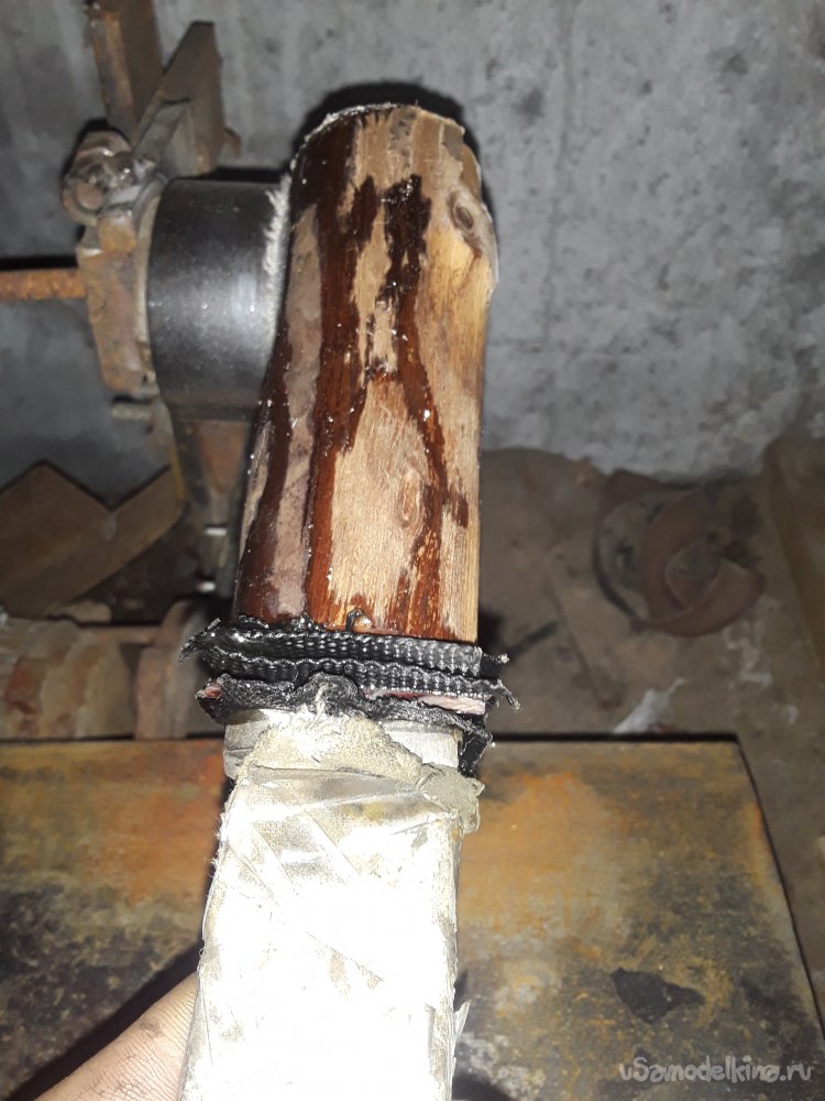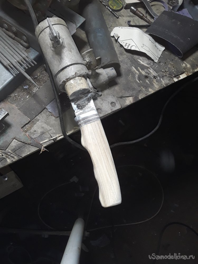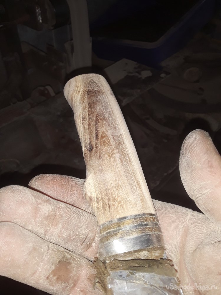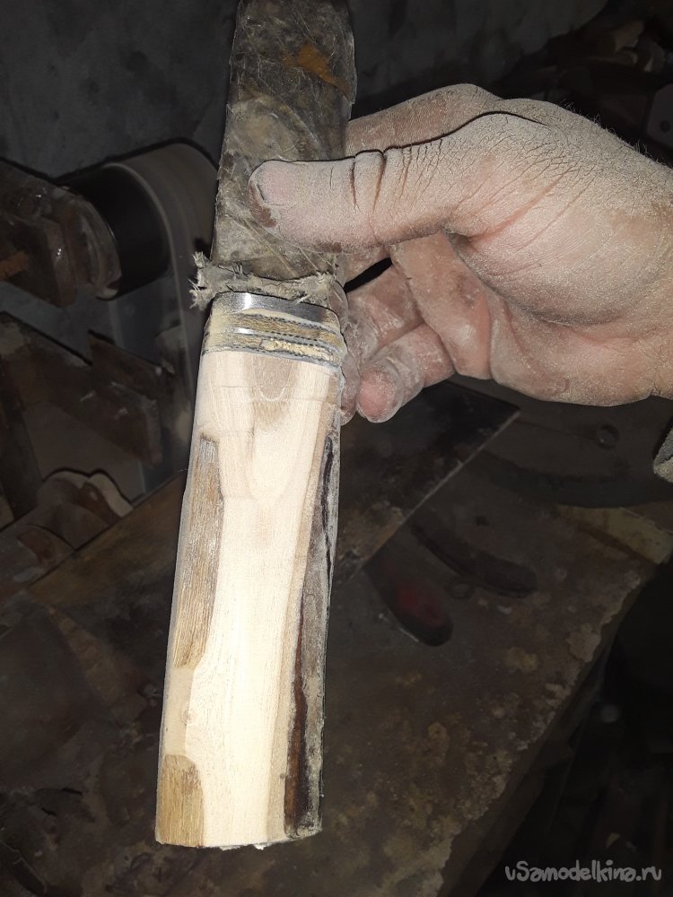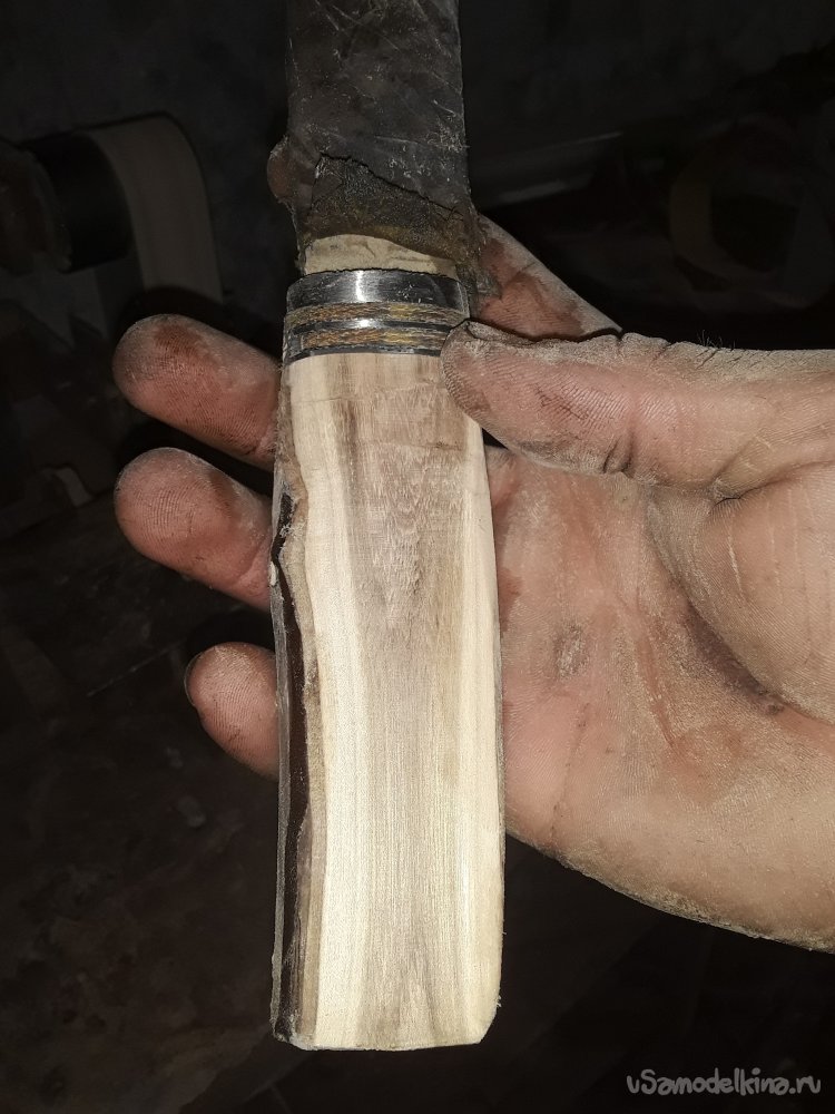 На следующие сутки клей высох и можно придавать нужную форму. Для симметричности рукояти делаю разметку по обуху и на грубой ленте убираю все лишнее на упоре с постоянным остужением чтобы не нагревать клинок, обрабатываю дерево.