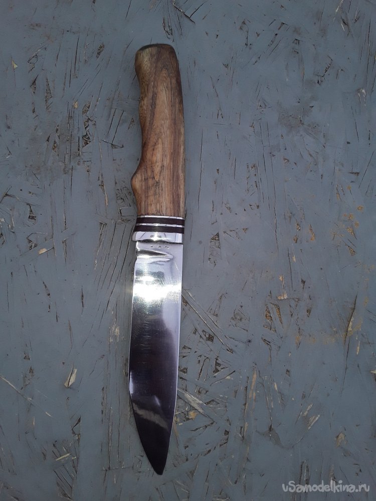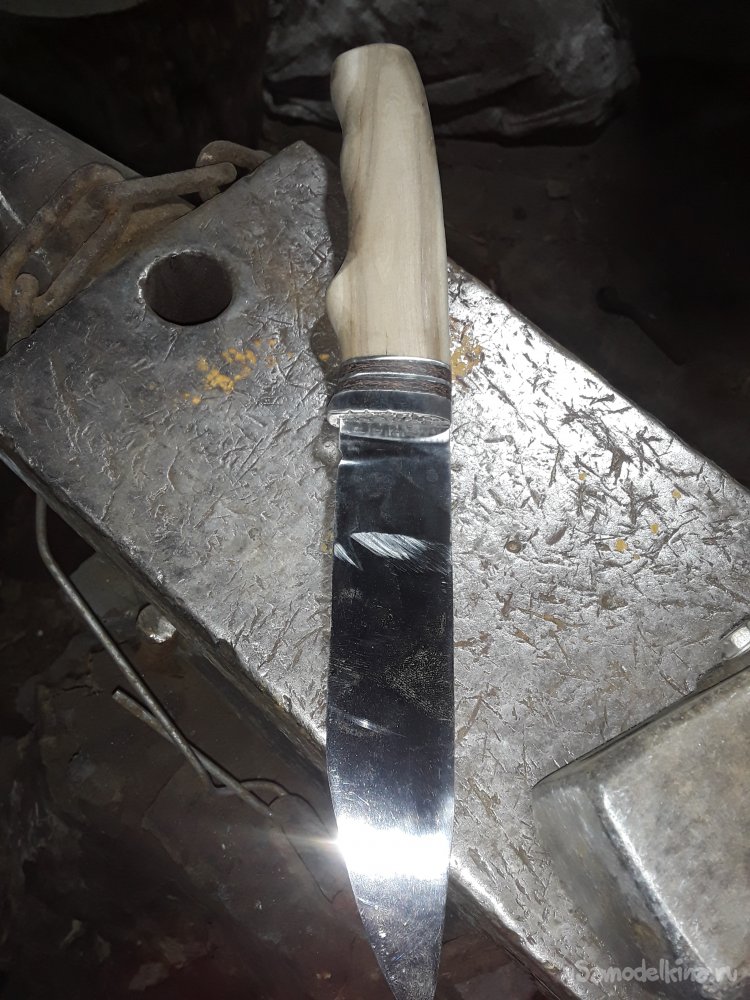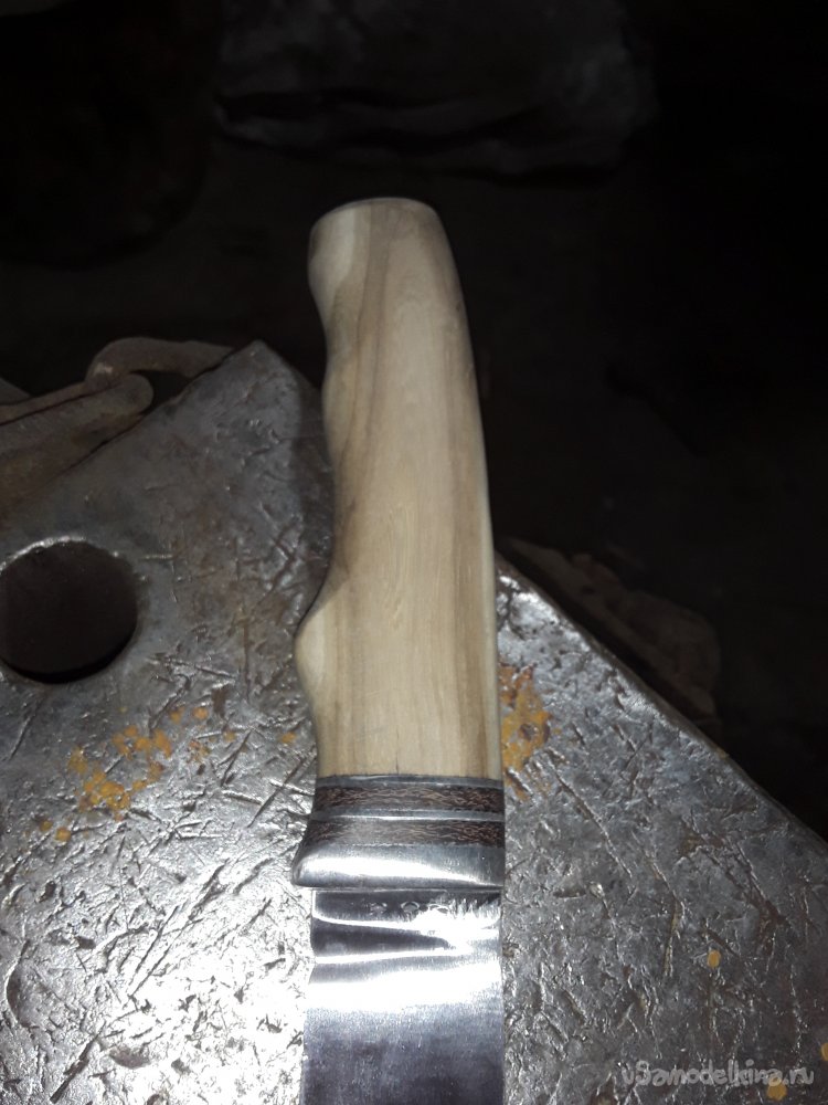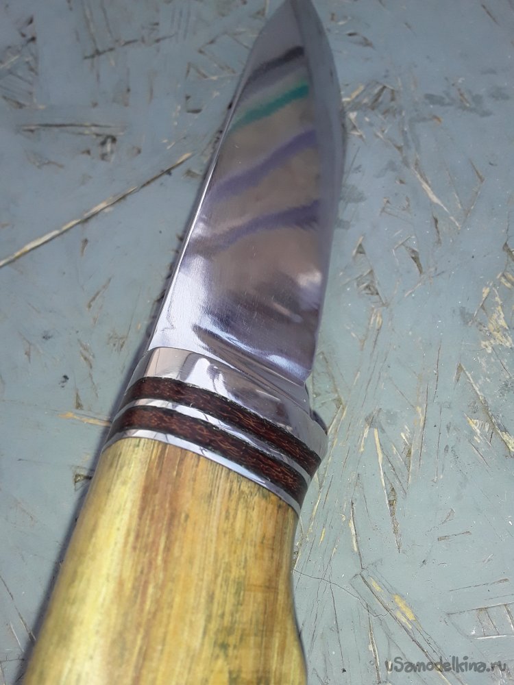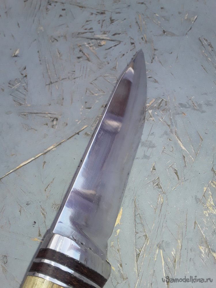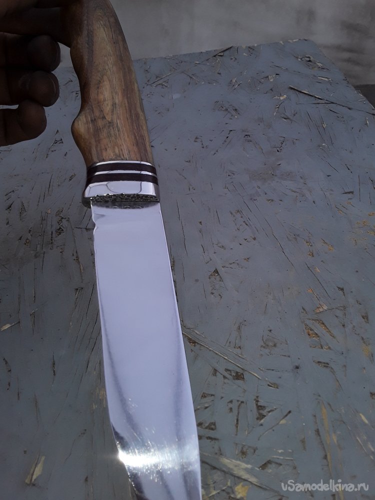 Ну вот и все осталось привести все в порядок для этого бумагой 400ед вручную шлифую каждый мм клинка и рукояти пока не будет рисок на метале и дереве. После этого на полировочном станке на войлочном круге с пастой гои полирую все в блеск это было самое трудоёмкое занятие из всех что было с этим ножом. При работе вроде бы все нормально, а посмотришь с другого угла, а там царапина как бы в глаза не бросается, но она мне мешает. В общем мат всему голова, но спустя 4 часа мучений, но я доделал все что нужно. Для защиты клинка я хотел протравить метал но хозяин сказал оставить блеск и если надо он сам его протравит. Думаю заржавеет он быстро хотя у плохого хозяина всегда нож ржавый если за ним ухаживать можно вполне даже пользоваться главное соблюдать гигиену. Ведь мы всегда моем руки после разделки мяса или любой другой работы с ножом и клинок нужно мыть, а потом протирать бумагой и тогда он просто немного потускнеет, но и не заржавеет. Это касается любой стали без легирующих добавок в сталь и тогда можно держать нож в зеркале. Но я бы такой нож все таки зачернил бы кислотой так клинок всегда будет без ржавчины.