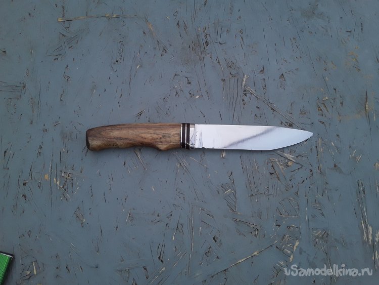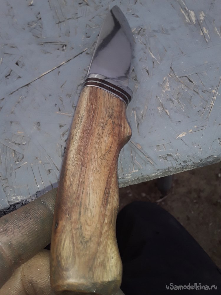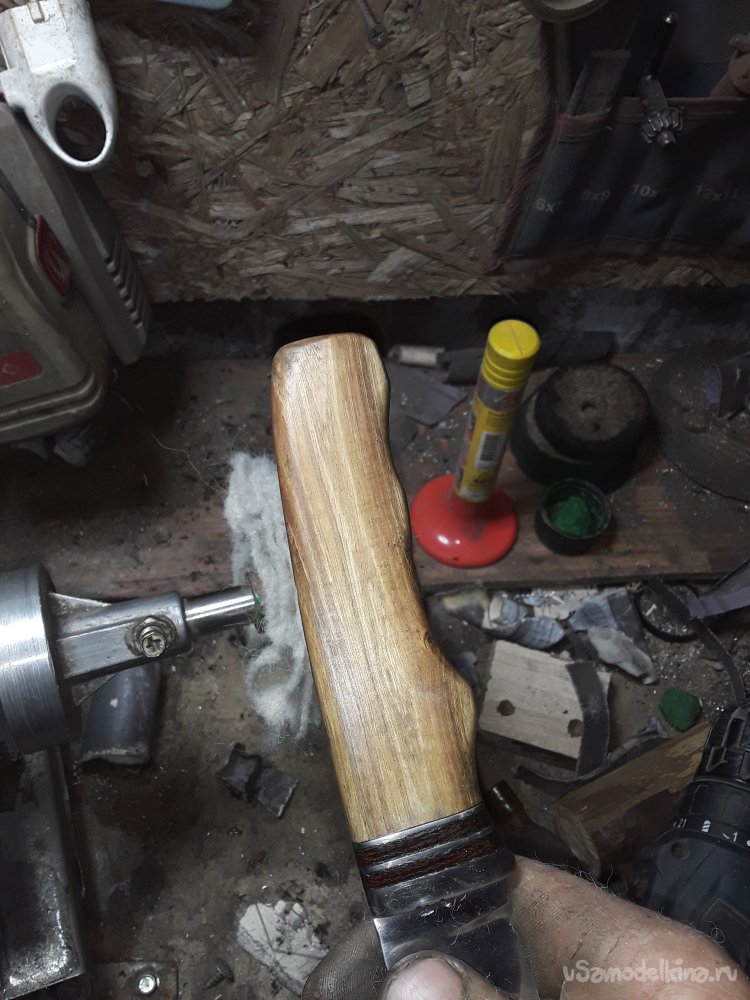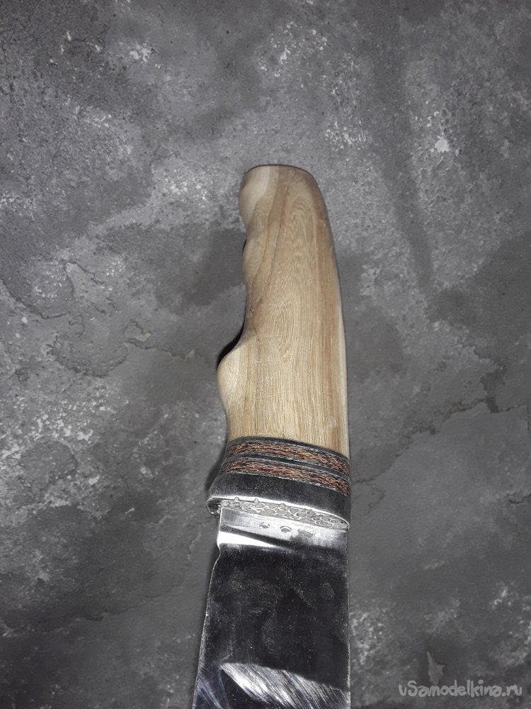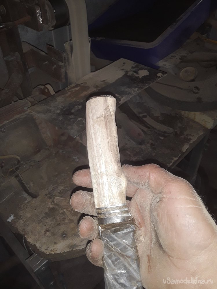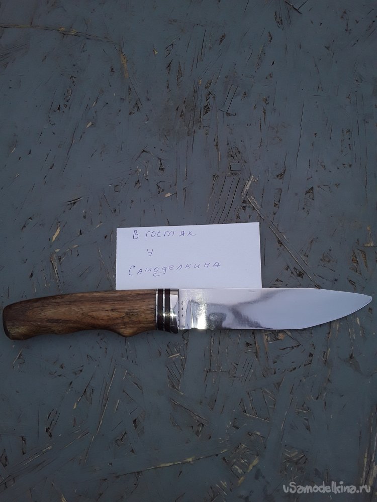 Ну вот и все осталось привести все в порядок для этого бумагой 400ед вручную шлифую каждый мм клинка и рукояти пока не будет рисок на метале и дереве. После этого на полировочном станке на войлочном круге с пастой гои полирую все в блеск это было самое трудоёмкое занятие из всех что было с этим ножом. При работе вроде бы все нормально, а посмотришь с другого угла, а там царапина как бы в глаза не бросается, но она мне мешает. В общем мат всему голова, но спустя 4 часа мучений, но я доделал все что нужно. Для защиты клинка я хотел протравить метал но хозяин сказал оставить блеск и если надо он сам его протравит. Думаю заржавеет он быстро хотя у плохого хозяина всегда нож ржавый если за ним ухаживать можно вполне даже пользоваться главное соблюдать гигиену. Ведь мы всегда моем руки после разделки мяса или любой другой работы с ножом и клинок нужно мыть, а потом протирать бумагой и тогда он просто немного потускнеет, но и не заржавеет. Это касается любой стали без легирующих добавок в сталь и тогда можно держать нож в зеркале. Но я бы такой нож все таки зачернил бы кислотой так клинок всегда будет без ржавчины.