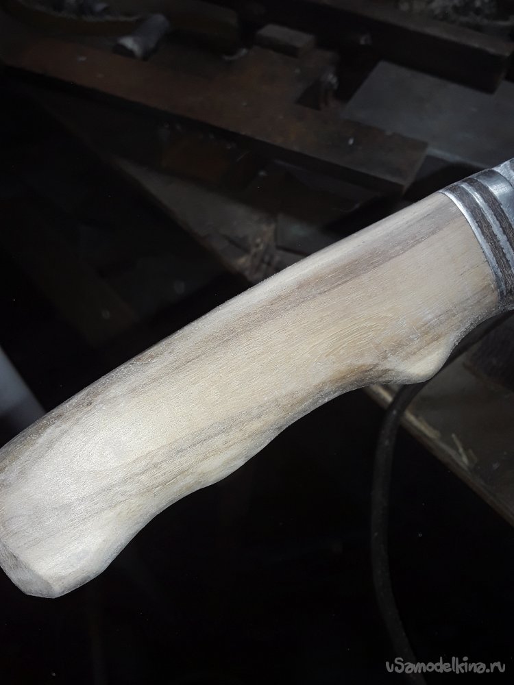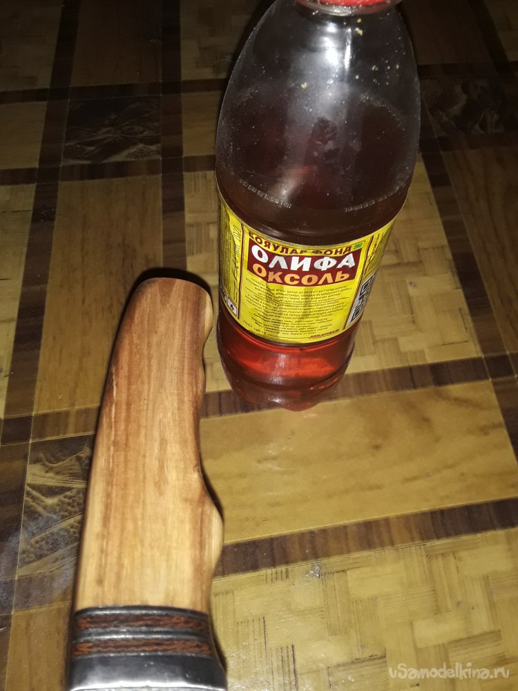 Для того чтобы рукоять была защищена от влаги и запахов ее нужны пропитать маслом для дерева. Самый дешевый способ это льняное масло или олифа я имею только второе. Для пропитки нагреваю олифу и помещаю туда рукоять и при постоянном подогревании через час 1.5 можно вытаскивать нож и мелкой бумагой шлифовать верхний слой потом еще раз в масло. После того как ручка стала тяжелее немного подсушиваю в печи при 120гр в течение часа так масло полимеризуется и можно полировать. При таком способе дерево не прям до конца пропитывается, но слоя вполне хватает для защиты да и еще бывало как то раз что при полной пропитке при запекании дерево лопается. После остывания печи вытаскиваю нож и прохожусь растворителем, чтобы убрать все масло с ножа.
