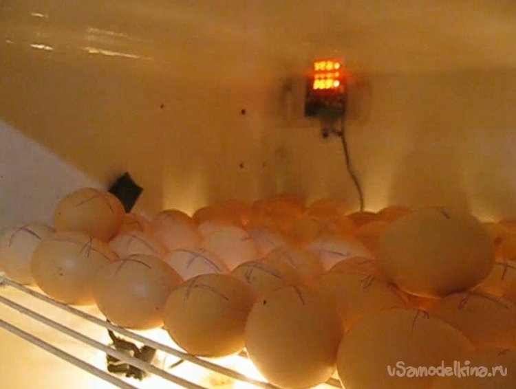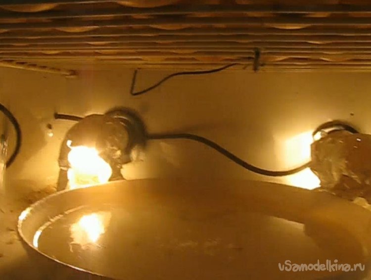 Две лампочки по 100Вт я включил через диод, чтобы частые включение не приводили к перегоранию нити накала. Лампы накрыты фольгой, чтобы на яйца не «светило теплом». Вот и все, теперь мой инкубатор работает очень хорошо!