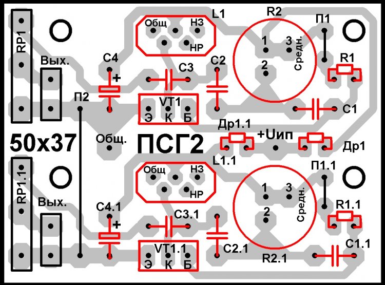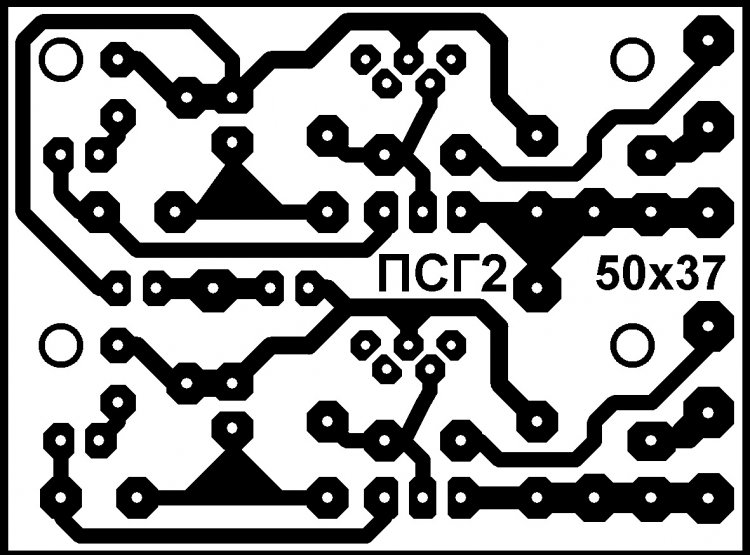 Печатная плата ПСГ2 выполнена из односторонне фольгированного стеклотекстолита размерами 50 х 37 х 1,5 мм (см. рисунки 2 и 3). Диаметр отверстий на печатной плате под радиоэлектронные компоненты – 0,8 … 1 мм, под соединительные проводники - 1…1,2 мм, под крепёжные отверстия – 3,2 мм.