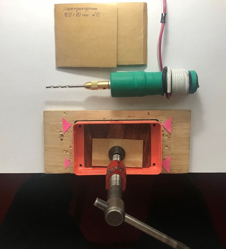 Разметка и сверление 4 отверстий диаметром 3,2 мм в чёрной крышке выполняется методом кондуктора. В качестве кондуктора используется корпус с уже просверленными отверстиями. Следует заметить, что без зажатия струбциной метод теряет своё главное свойство – точность разметки.