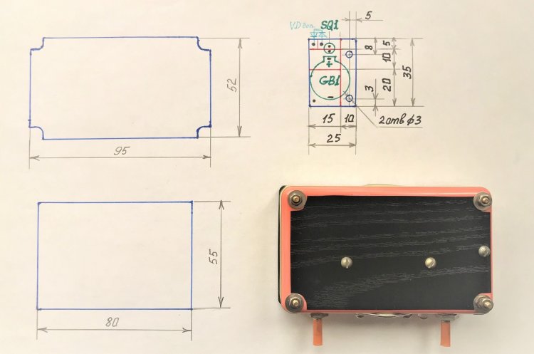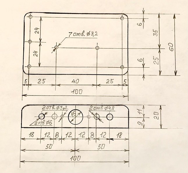 Эскиз доработки корпуса (большей половинки от мыльницы) ПСГ2 разметкой центров отверстий и их сверлением.