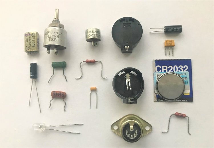 Радиоэлектронные компоненты, применённые в ПСГ2. Общие для обеих каналов ПСГ2: батарея GB1 и её держатель (с двух сторон), SQ1, HL1, R3, XS1. Остальные детали показаны в количестве, необходимом для одного канала.