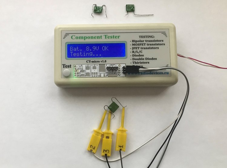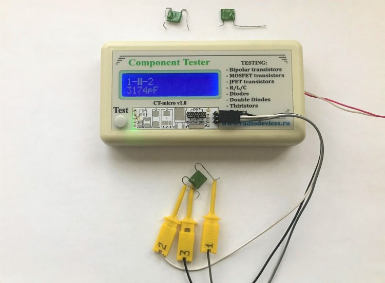 Измеренная емкость конденсатора, зажатого между «крокодильчиками» №1 и №2, равна 3,174 нФ.