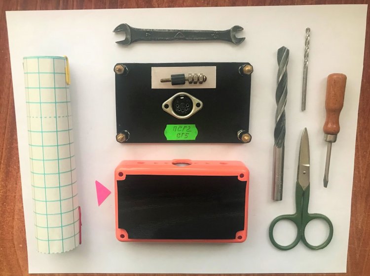 Сверху - пластиковая крышка (тиснением наружу) с закреплёнными на ней четырьмя стойками. Снизу - все составные части ПСГ2, размещённые в корпусе. Вид на печатную плату - со стороны деталей.