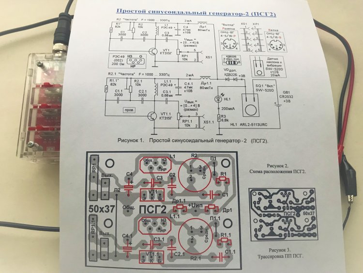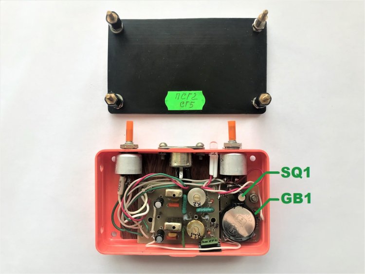 В ПСГ2 применены постоянные резисторы ОМЛТ, С2-23, С2-33. Конденсаторы C1, C2, C1.1, C2.1, C3, С3.1 керамические типа КМ, К10-17 или зарубежного производства. Остальные конденсаторы оксидные типа К50-35 или зарубежного производства, например, серии CFM фирмы «Maron» или серии ТК фирмы «Jamicon». Дроссели Др1 и Др1.1 типа ДМ0,1. Транзисторы VT1 и VT1.1 КТ315Г можно заменить КТ3102 или КТ315 с любым буквенным индексом. Красный светодиод HL1 с повышенной светоотдачей ARL2-5113URC можно заменить красным FYL-5013URC или жёлтым ARL-5013UYC. Вместо электромагнитных реле РЭС49 (002) можно использовать малогабаритный капсюль ТМ-2В от ушного телефона. При увеличении размеров корпуса - телефонный капсюль ТК-67. Вместо GB1 CR2032 можно применить CR2025. Высота батарейки CR2025 не 3,2 мм, а 2,5 мм. Поэтому в отсеке, рассчитанном на батарейку CR2032, возможно придётся просто слегка подогнуть контактный лепесток «минус».