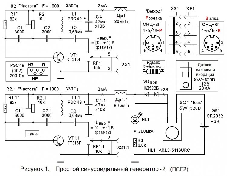 Оба канала ПСГ2 собраны по схеме близкой схеме RС-генератора с фазосдвигающими цепями. Однако за счёт использования индуктивности (обмотки реле) вместо одного из элементов фазосдвигающей цепочки, в нём использовано меньшее количество элементов. При этом диапазон питающего напряжения гораздо шире и начинается с 1,2 Вольта.