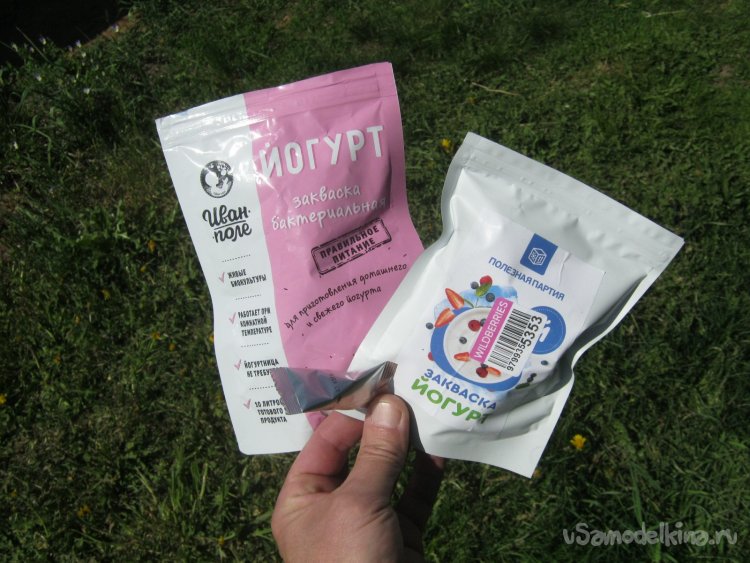 Фото 4. Два варианта сухих заквасок. В пальцах – одна порция. Рекомендуется на литр молока, но практика показывает - хорошо работает и в объеме в два раза большем. При этом консистенция готового йогурта – есть ложкой.