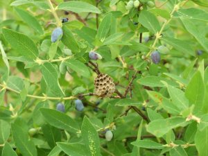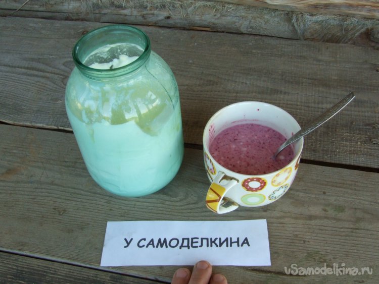 Фото 9. Йогурт после приготовления, а это 8 часов, следует охладить и держать в холодильнике, и опять таки, банка здесь удобна. Набираем из неширокого горлышка небольшим половником-поварёжкой. К слову, готовить и хранить йогурт в большом сосуде и черпать из него в другие помельче, гораздо практичнее порционного приготовления, в крохотных баночках, как например в аппарате специальном - йогуртнице. При этом много удобнее добавлять в йогурт фрукты-ягоды – сам по себе он не так хорош. На фото – йогурт с замороженными дробленными ягодами ирги, плюс чуток сахара. Объеденье!