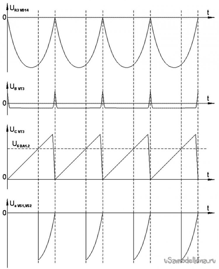 Напряжение отрицательной полуволны с отрицательного вывода выпрямительного моста питания схемы подается на резистор R20, через который попадает на базу транзистора VT3 и держит его закрытым в течение всей полуволны напряжения сети. За это время по экспоненте (особая линейность здесь без надобности, поэтому начальный участок экспоненты сойдет), через резистор R23 заряжается конденсатор C3. В момент перехода полуволны напряжения сети в ноль, транзистор VT3 за счет резистора R21 открывается и разряжает конденсатор C3. Так достигается синхронизация ШИМ модулятора с частотой сети. Диод VD14 необходим для исключения влияния фильтрующих конденсаторов C6, C8. Диод VD15 защищает базу транзистора VT3 от пробоя отрицательным напряжением.