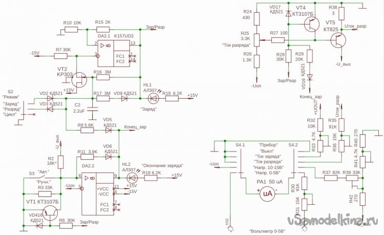 На ОУ DA2.2 собран компаратор автоматического окончания заряда. Подразумевалось, что эта фишка будет работать только в режиме «Цикл». На инвертирующий вход подано опорное напряжение, на прямой вход – выходное, через делитель R2R3. Как только выходное напряжение становится ниже опорного, на выходе ОУ устанавливается «-», что является сигналом «Окончание заряда», который останавливает мультивибратор цикла в состоянии «Разряд» и отключает электронную нагрузку. Замер напряжения аккумулятора производится в состоянии цикла «Разряд», т.к. в состоянии «Заряд» мы будем мерить не напряжение аккумулятора, а выходное напряжение тиристорного выпрямителя. В состоянии «Заряд» вход компаратора блокируется ключом на транзисторе VT1. Замыкание выключателя S3 так же блокирует вход компаратора, отключая автоматический режим.