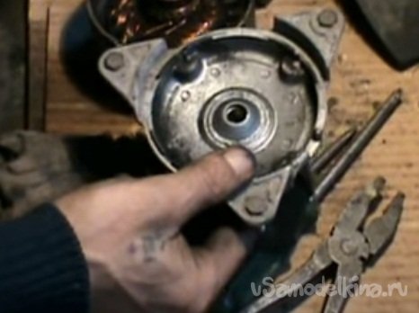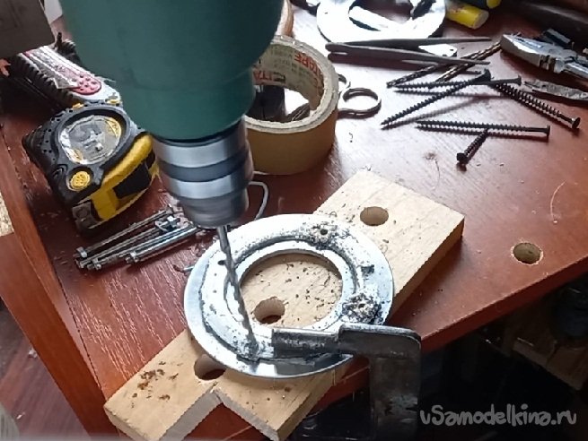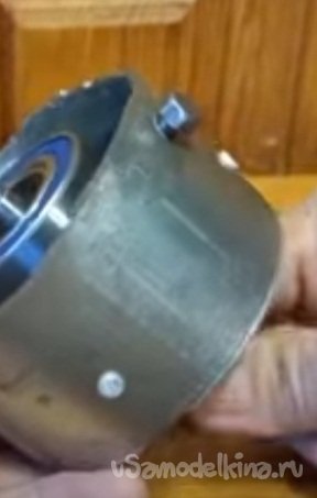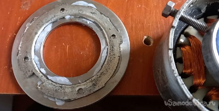 Третьим шагом по улучшению двигателя, нужно было усилить вращающийся колокол (ротор) и наконец, то убрать регулировочные болты, которые не давали напихать больше меди. На приемке металлолома нашел крышку от данной модели вентилятора ВАЗа, болгаркой обрезал лишнее, получилось кольцо с посадочными выступами и отверстиями под стягивающие болты. Болты, обжимающие подшипник статора, теперь можно удалить. Вместо их приготовил кольцо 4мм толщиной, внутренний размер пятьдесят пять, наружный сто десять. Задача состояла в том, что бы точно просверлить в нем отверстия. Малейшее смещение приведет несоответствие просверленных отверстий и посадочного отверстия под подшипник статора и ничего не соберется. Ничего проще не придумал, как собранные детали вместе склеить между собой силиконом перед сверлением, Спустя сутки, вынул склейку из двигателя и высверлил по отверстиям посадочного кольца бывшей корпусной крышки. Провел предварительную сборку с затяжкой всех гаек. Получилось, все как планировал, никаких зацепов и трений.
