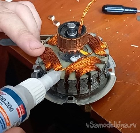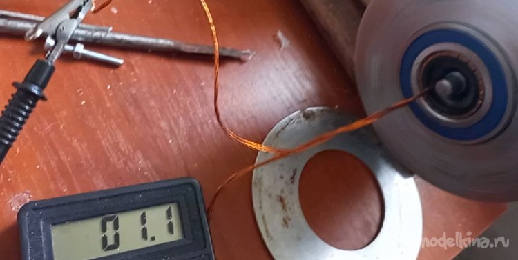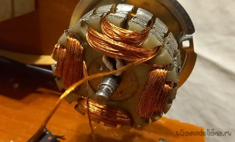 Единственный недостаток, это две обмотки в ограниченном пространстве. В этот раз, намотку сделал жилой из шести проводов по 0.4 мм. Это вроде составило 0.75 квадрата. На каждый полюс уложил сорок витков, Длина жилы 17 м.