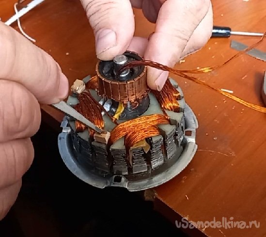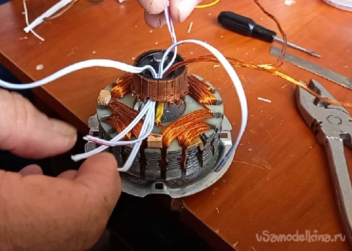 Вторым шагом в усовершенствовании электродвигателя, это увеличение сечения меди в статорных катушках. Как я раньше делал, Наматывал как бы две катушки на один сердечник, соединял начало первой обмотки с концом второй и в этом месте подключал плюс питания. К двум оставшимся концам датчик Холла поочередно подключал минусу того же питания. В результате катушка меняла магнитное поле, толкая постоянные магниты. Такой вариант, для меня был очень интересный своей простотой и малым количеством деталей.