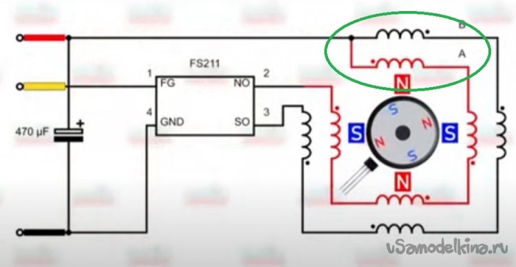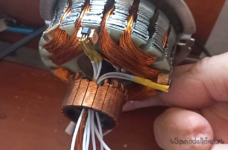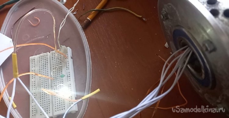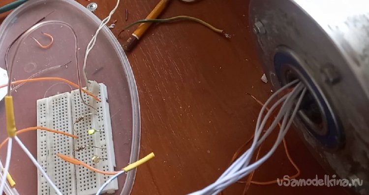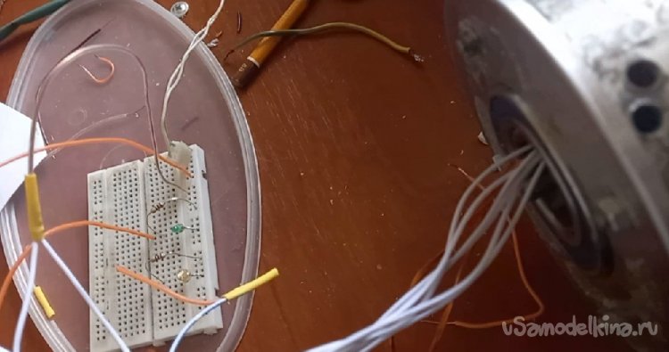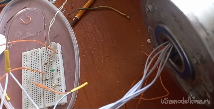 Закрепив микросхему с датчиком Холла между катушками, проверил ее работоспособность от магнитов двигателя, подключив светодиоды. Все переключается при смене магнитных полюсов как гирлянда на елке.