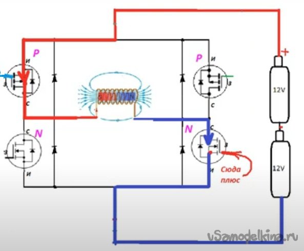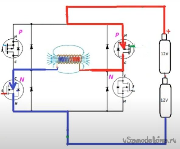 б - Можно было бы запустить на базе Н-моста, как в проекте с ПОВЫШАЮЩИМ ПРЕОБРАЗОВАТЕЛЕМ С 12 ДО 220 В, но мой Н-мост занят, а «Р» мосфет у меня в одном экземпляре, а идти в радио лавку не охота.
