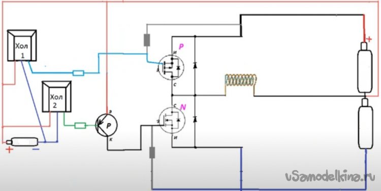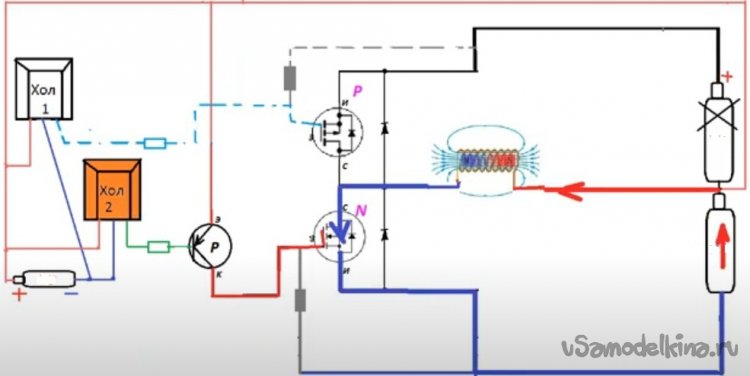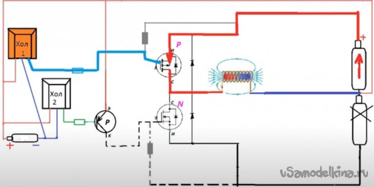 И хотя этот датчик Холла отлично показал себя в работе с двумя противофазными катушками, он удерживал «0» или «1» до тех пор, пока не менялось магнитное поле, я в этом проекте решил применить два датчика Холла. Они срабатывают относительно друг друга с разрывом по включению. То есть если проследить по светодиодам, загорается один светодиод, когда он тухнет и загорается другой, существует пауза. Это как мне кажется, уберет возможность сквозняка при переключении «Р» «N» мосфетов.