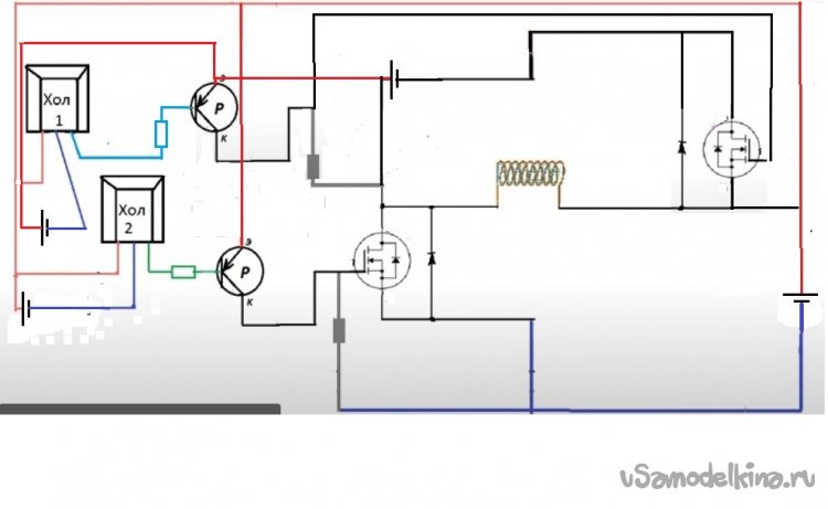 Я же в своем проекте применил P-N полумост на мосфетах и добавил отдельное питание для датчиков. Как мне показалось, не судите строго, этот прием обезопасит датчики от всплеска напряжения самоиндукции. Положительный выход питания датчиков подключил к положительной клемме аккумулятора нижнего плеча.