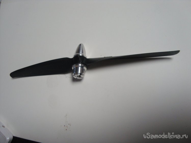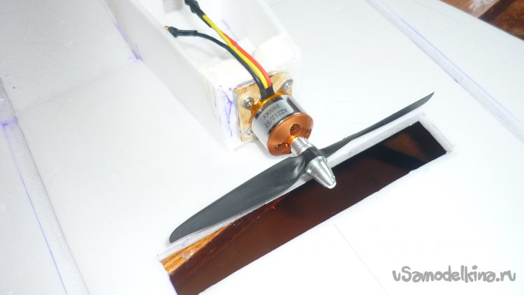 На заготовку приклеил кусочек 3 мм. фанеры и укрепил мотор с винтом.