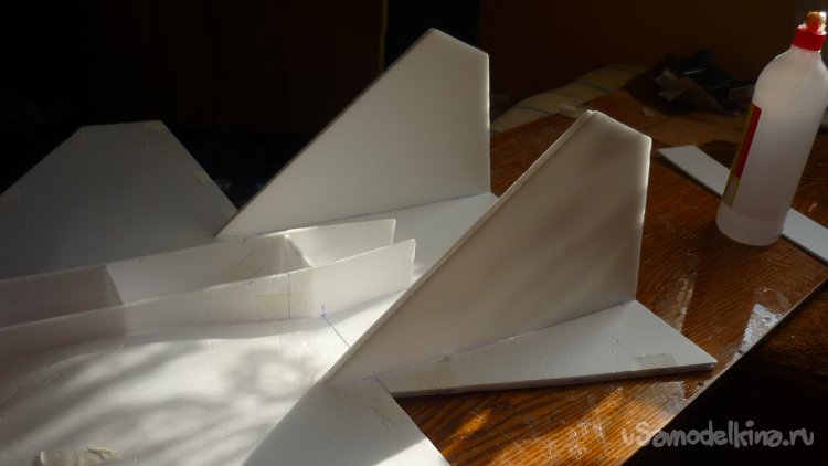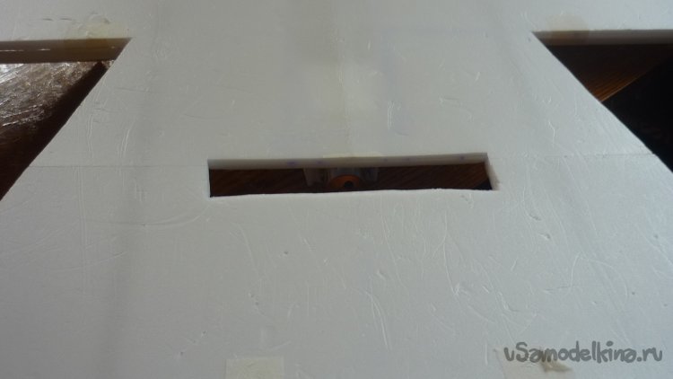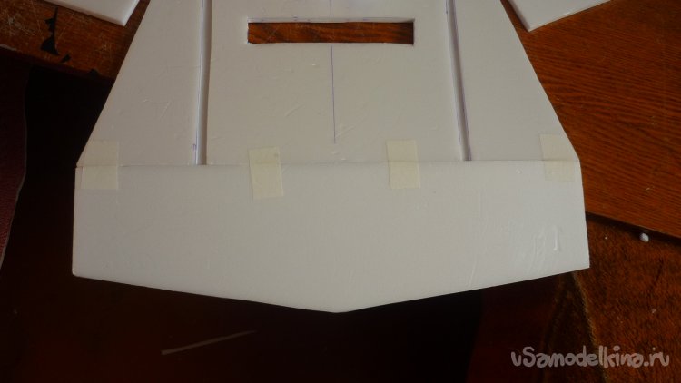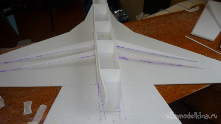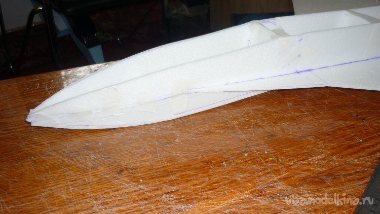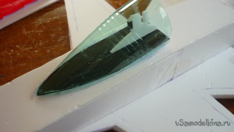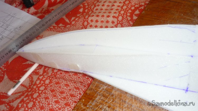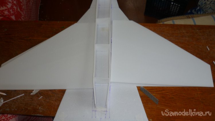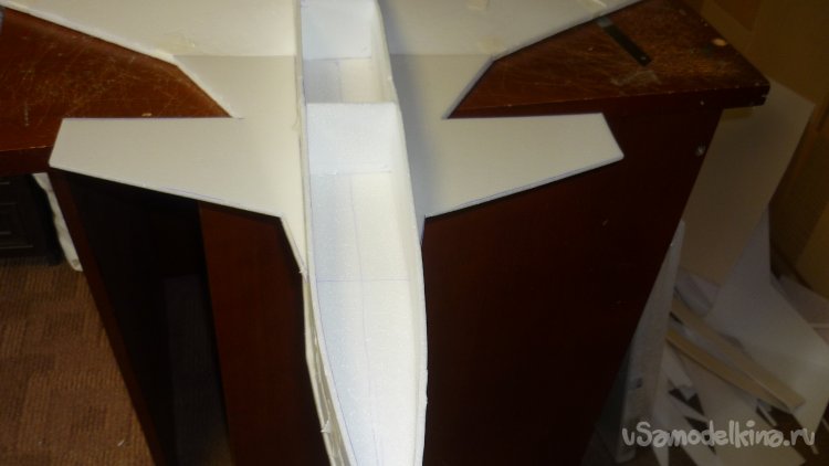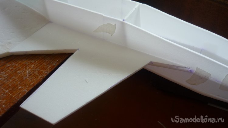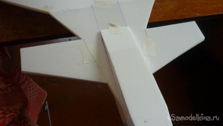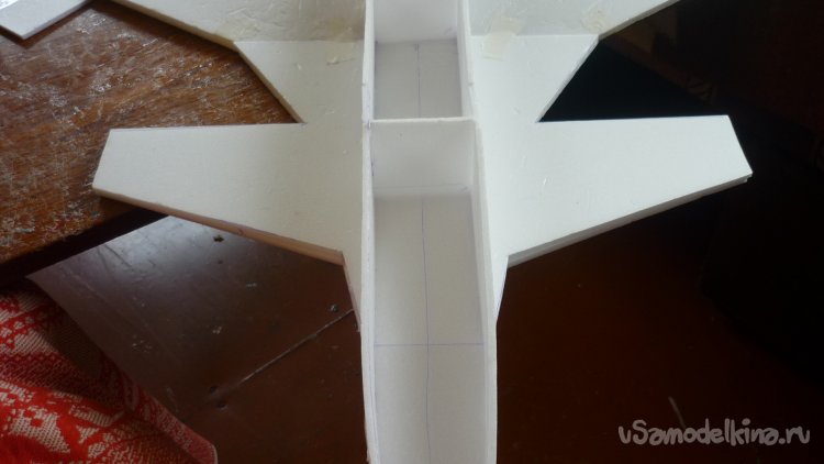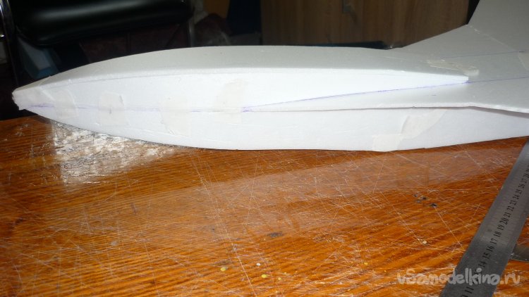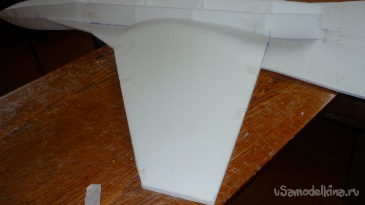 Сделал прорезь где будет вращаться винт, навесил руль высоты и прорезал места для установки килей.