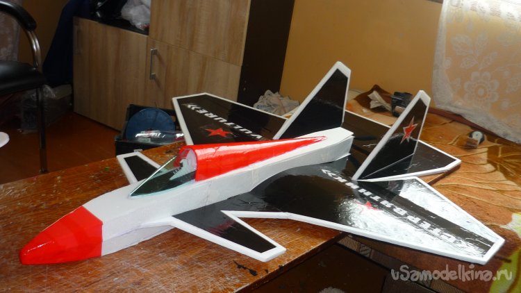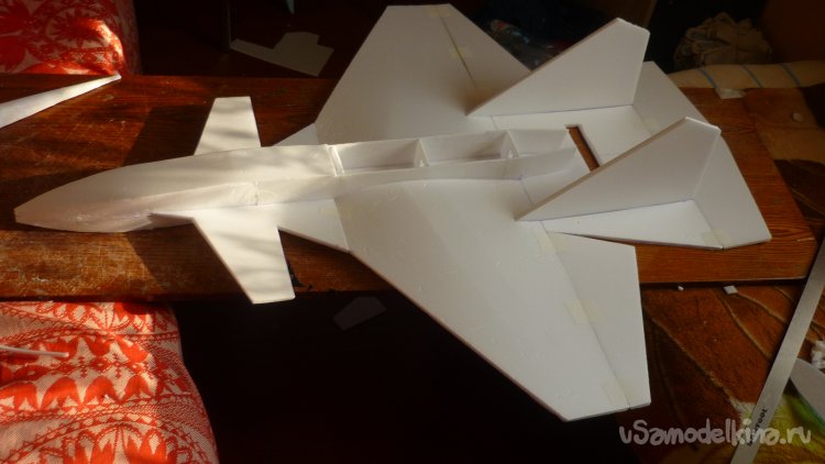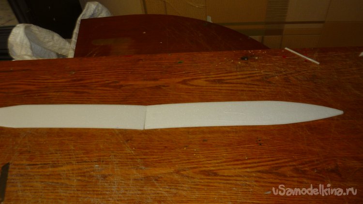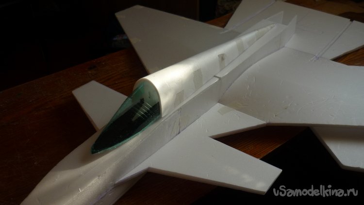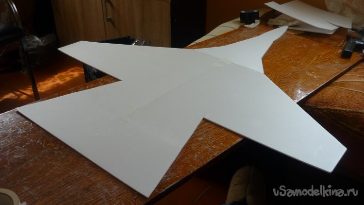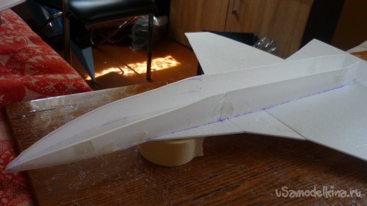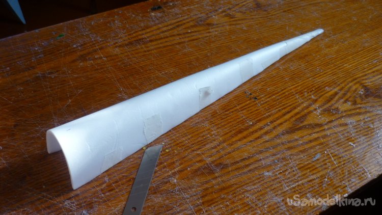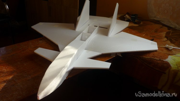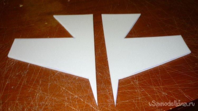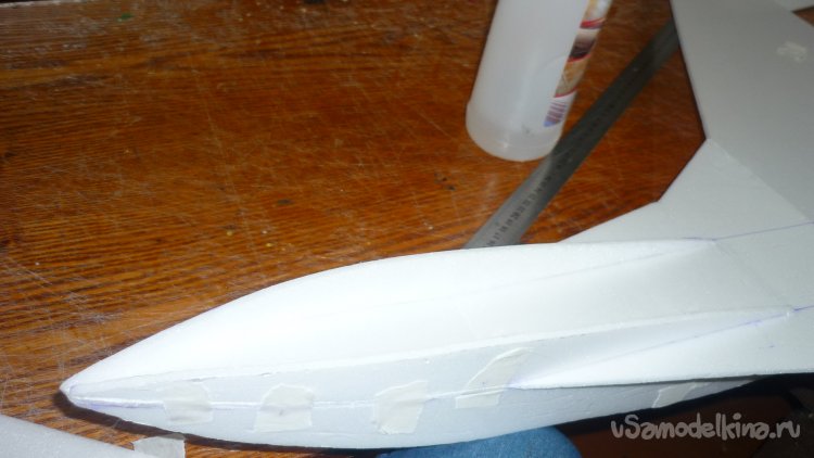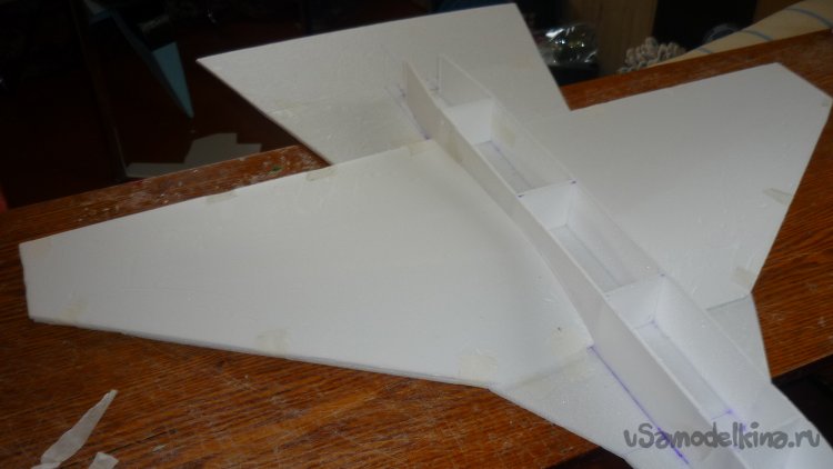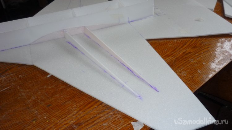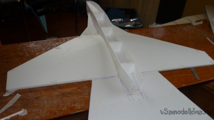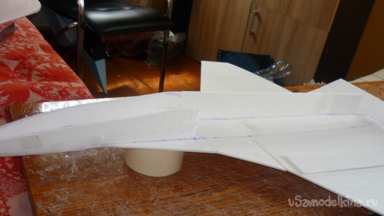Сделал прорезь где будет вращаться винт, навесил руль высоты и прорезал места для установки килей.
