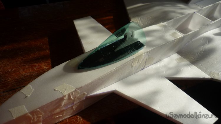 Внутреннюю плоскость кабины обтянул чёрным скотчеv, вырезал фигурку пилота и смонтировал кабину.