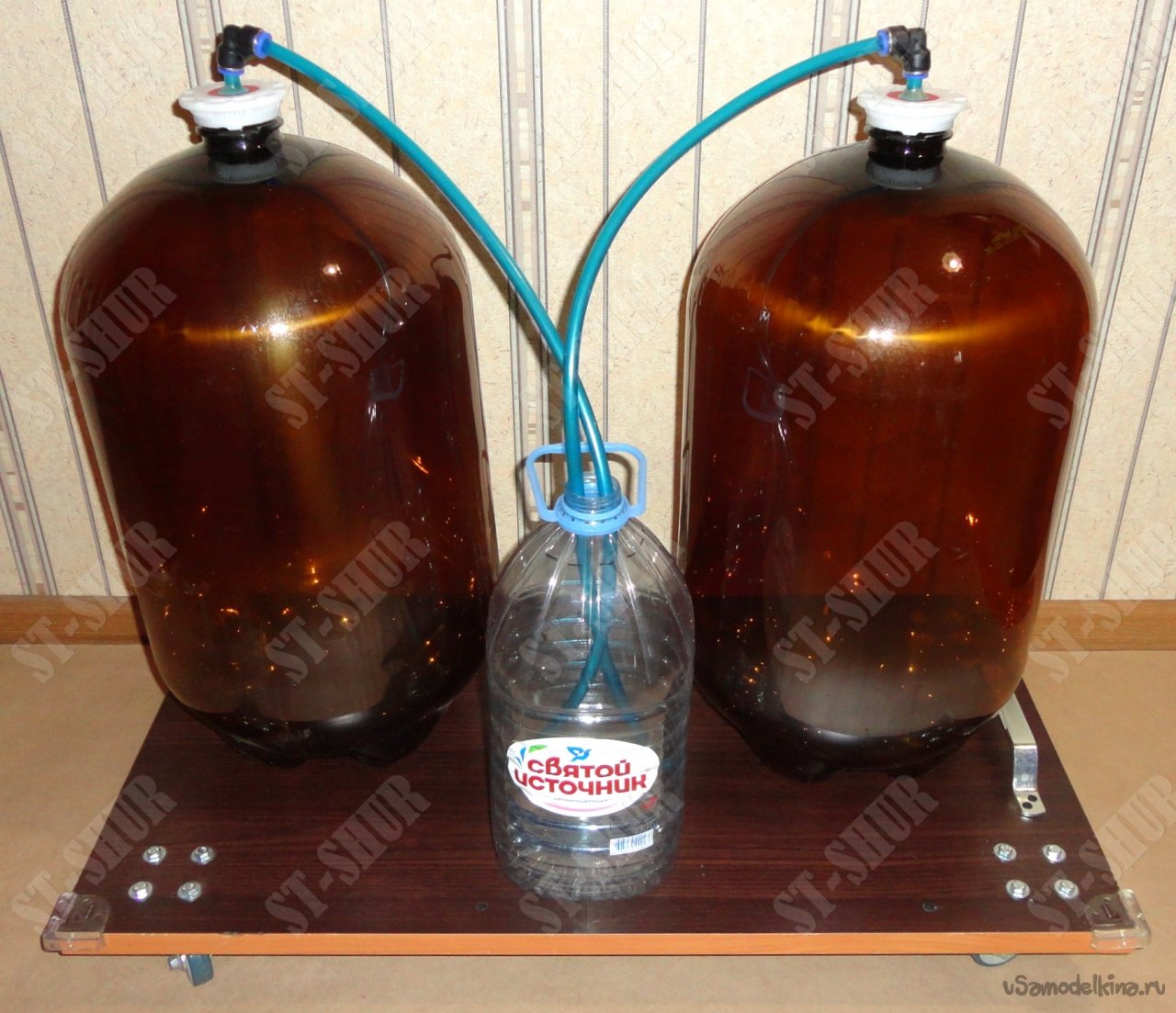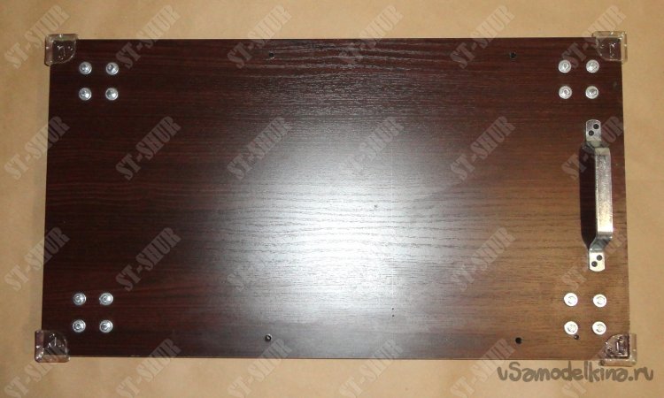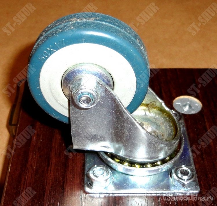 Тележка была изготовлена из имевшейся в наличии плиты ЛДСП размерами 445х800х23мм. На ней были установлены поворотные колеса 50х17мм, которые крепятся болтами М6. Самоклеющиеся демпферные уголки дополнительно закреплены скобами степлера. Тележку достаточно удобно перемещать с помощью ремешка закрепляемого на привинченной к ней ручке. На данной тележке могут размещаться либо одна емкость на 50л или 2 кеги по 30л плюс дополнительная емкость 3-6л.
