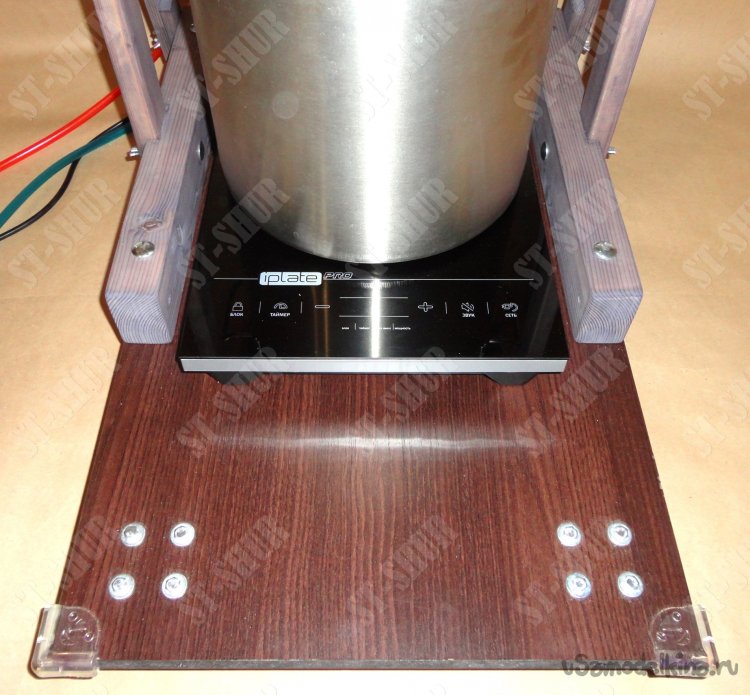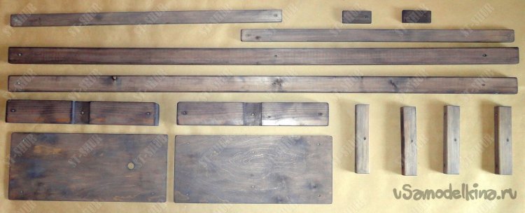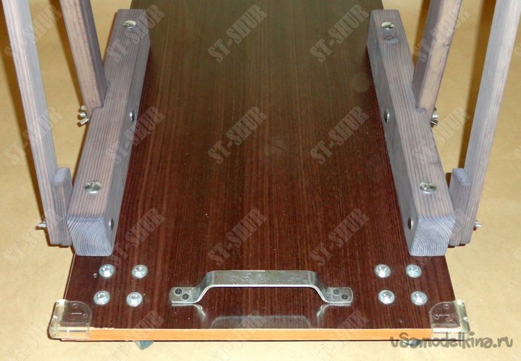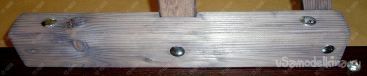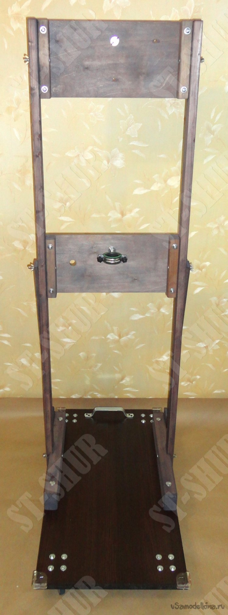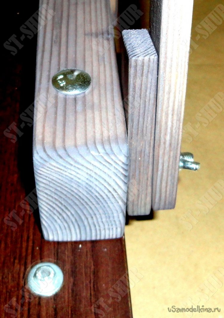 Детали стойки размечались и изготавливались сразу по месту, исходя из имевшихся в наличии материалов, при установленном дистилляторе с колонной на тележке с индукционной плиткой. После шлифовки все детали были обработаны спиртовой морилкой. Вертикальные стойки изготовлены из вальцованных реек размерами 25х50х1500мм. Основные держатели стоек изготовлены из брусков размерами 44х68х440мм. Дополнительные держатели стоек изготовлены из реек размерами 13х37х817мм с дополнительными прокладками размерами 13х37х85мм (из тех же реек).