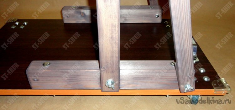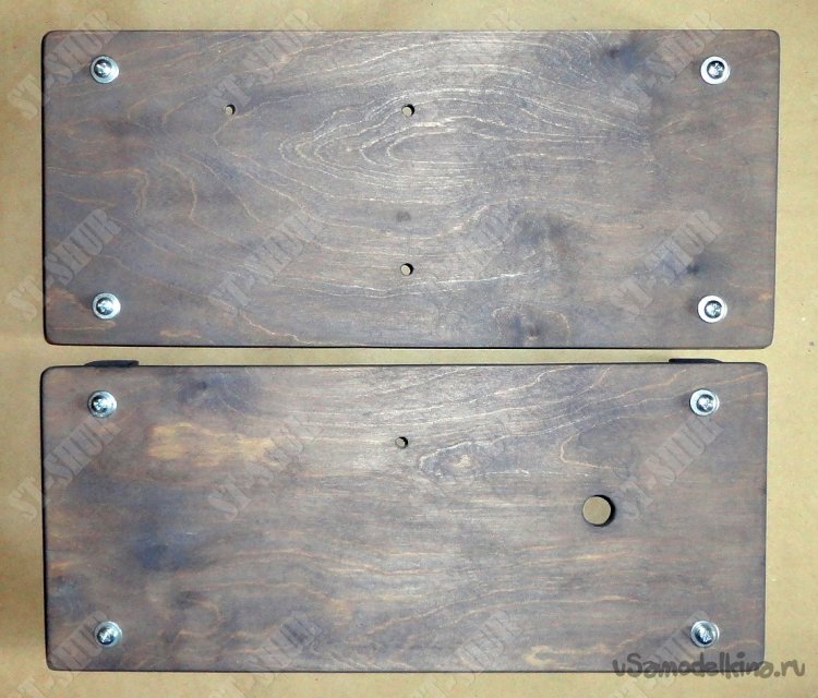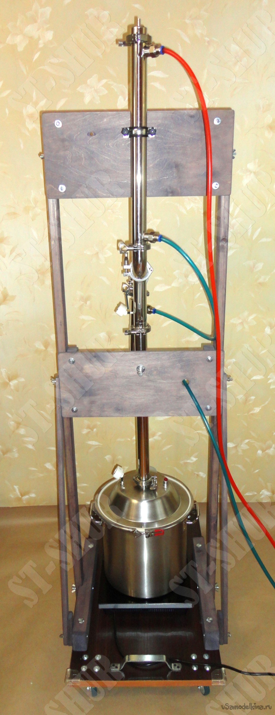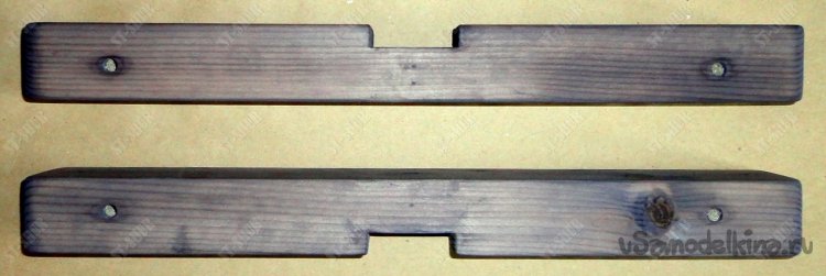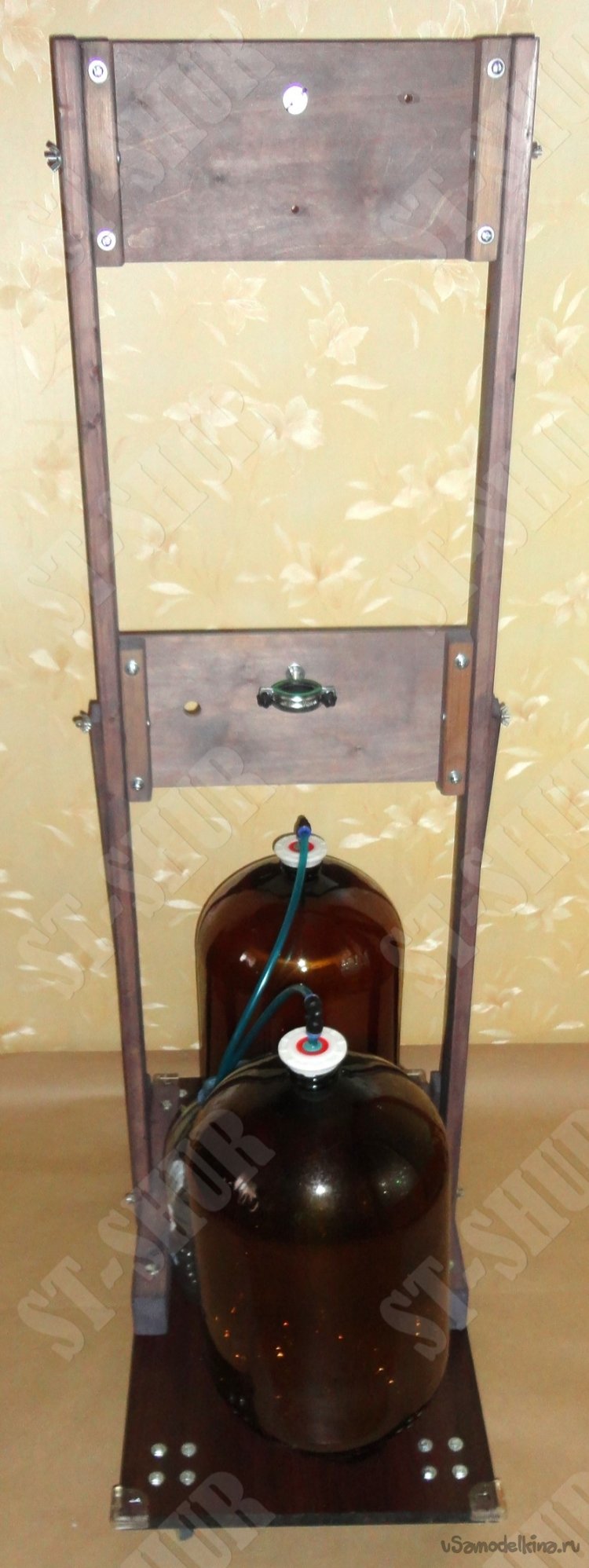Детали стойки размечались и изготавливались сразу по месту, исходя из имевшихся в наличии материалов, при установленном дистилляторе с колонной на тележке с индукционной плиткой. После шлифовки все детали были обработаны спиртовой морилкой. Вертикальные стойки изготовлены из вальцованных реек размерами 25х50х1500мм. Основные держатели стоек изготовлены из брусков размерами 44х68х440мм. Дополнительные держатели стоек изготовлены из реек размерами 13х37х817мм с дополнительными прокладками размерами 13х37х85мм (из тех же реек).