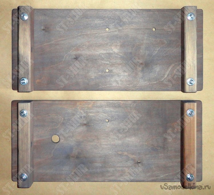 Горизонтальные полки изготовлены из фанеры толщиной 10мм и имеют размеры 200х465х10мм. Крепежные планки для полок изготовлены из обрезков вальцованной рейки размерами 30х40х200мм и крепятся к полкам с помощью винтов М6. В полках были просверлены отверстия диаметром 8мм, а в нижней полке еще и отверстие диаметром 20мм (пока на данный момент). В основных держателях стоек фрезером сделаны пазы глубиной 12мм, благодаря чему при сборке конструкции вертикальные стойки упираются в основание тележки.