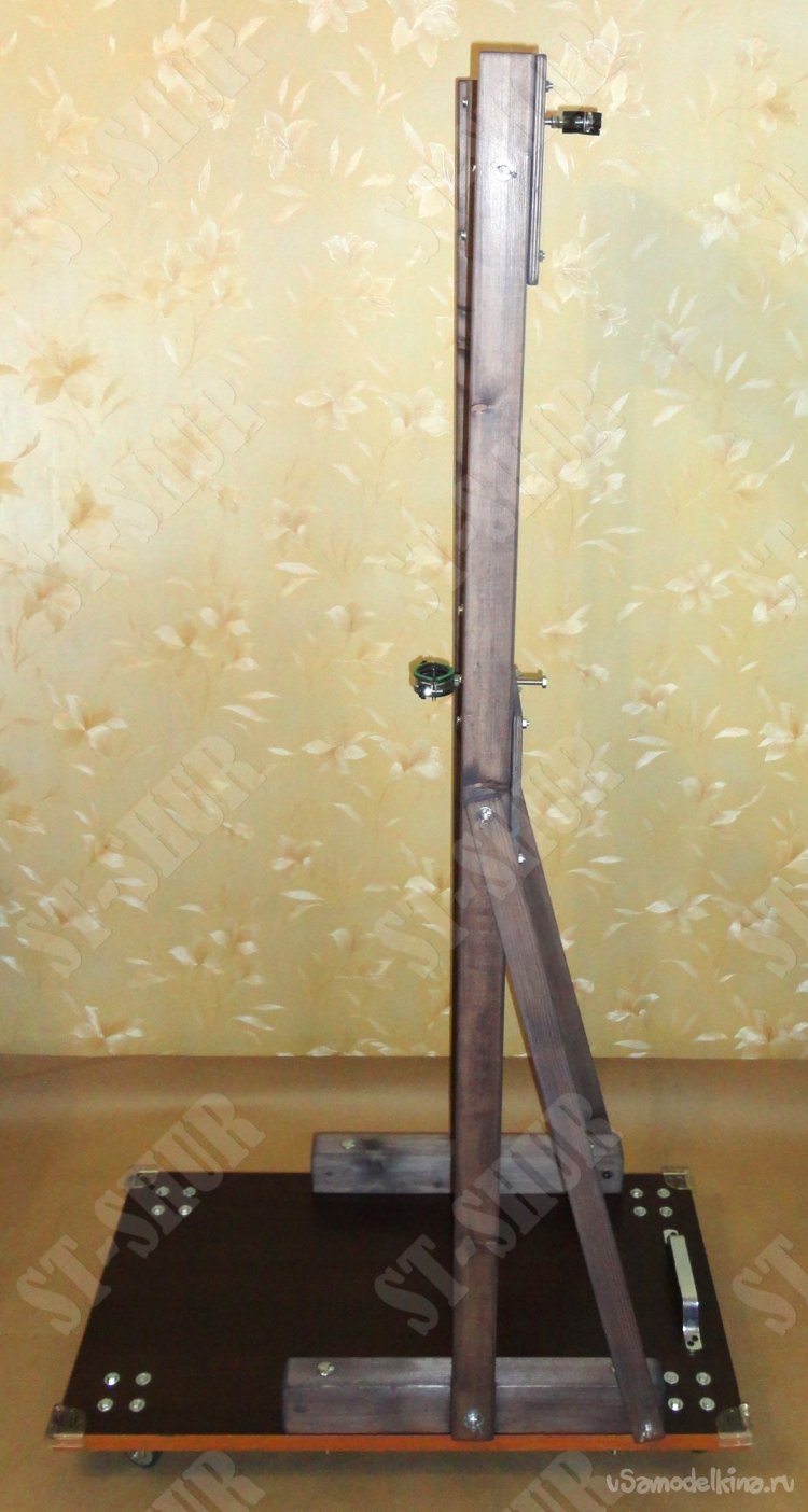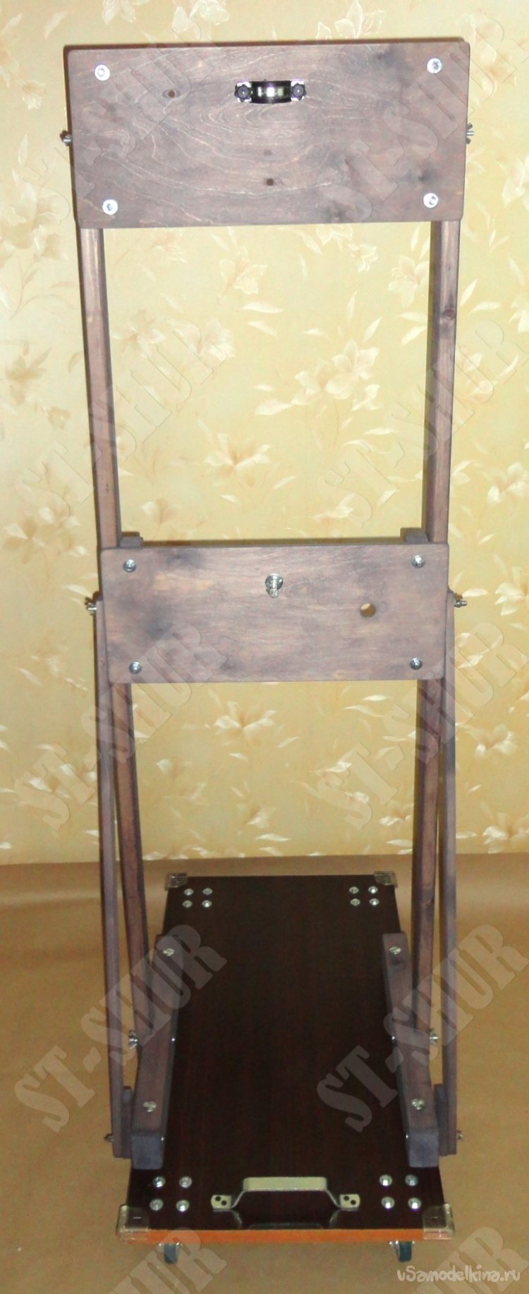 В результате получилась очень приличная жесткость всей конструкции. Каких либо «гуляний» колонны не наблюдается. После использования и разборки конструкции, детали стойки укладываются на тележку и «уезжают» на ней под кровать, не занимая лишнего места в комнате.