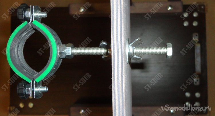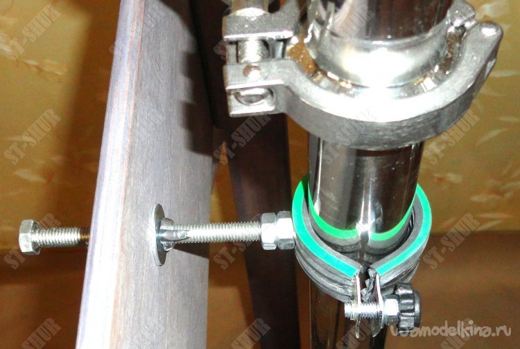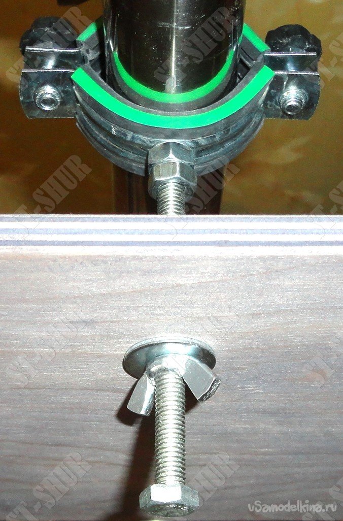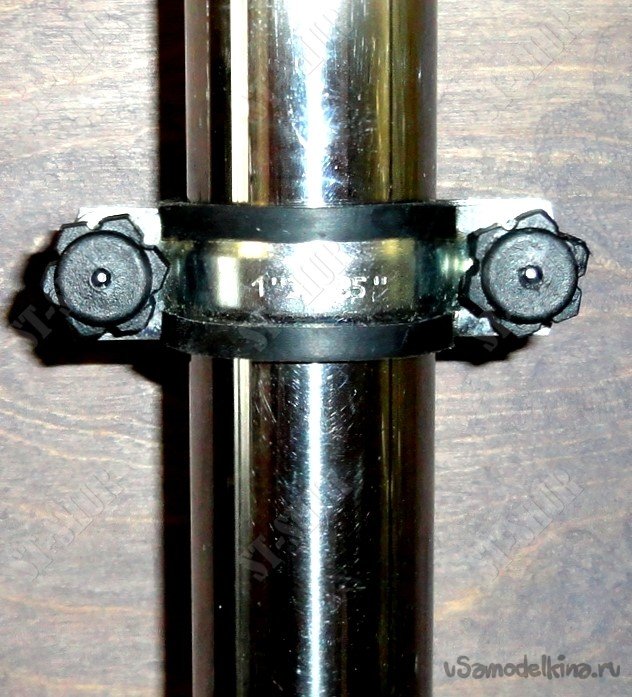 Штатные винты хомутов заменены на регулируемые винтовые мебельные опоры с винтом М6, что повышает удобство фиксации колонны. На данный момент используется верхний хомут 32-35мм, нижний хомут 39-46мм (с учетом возможности установки штатного утеплителя царги).