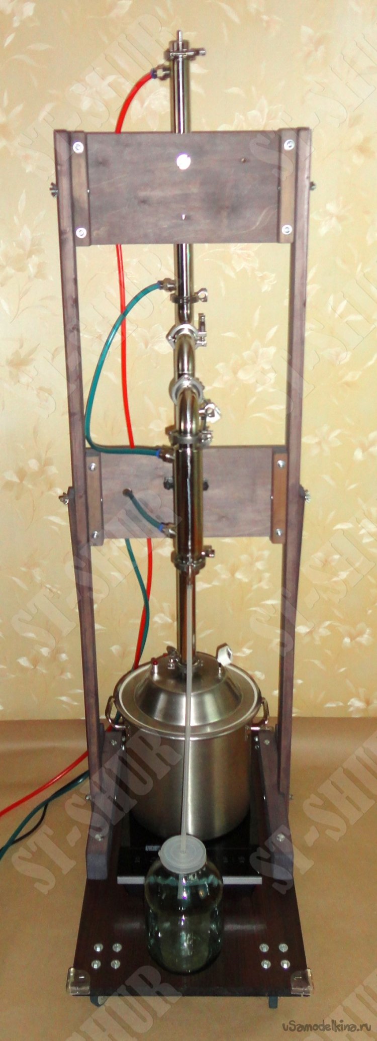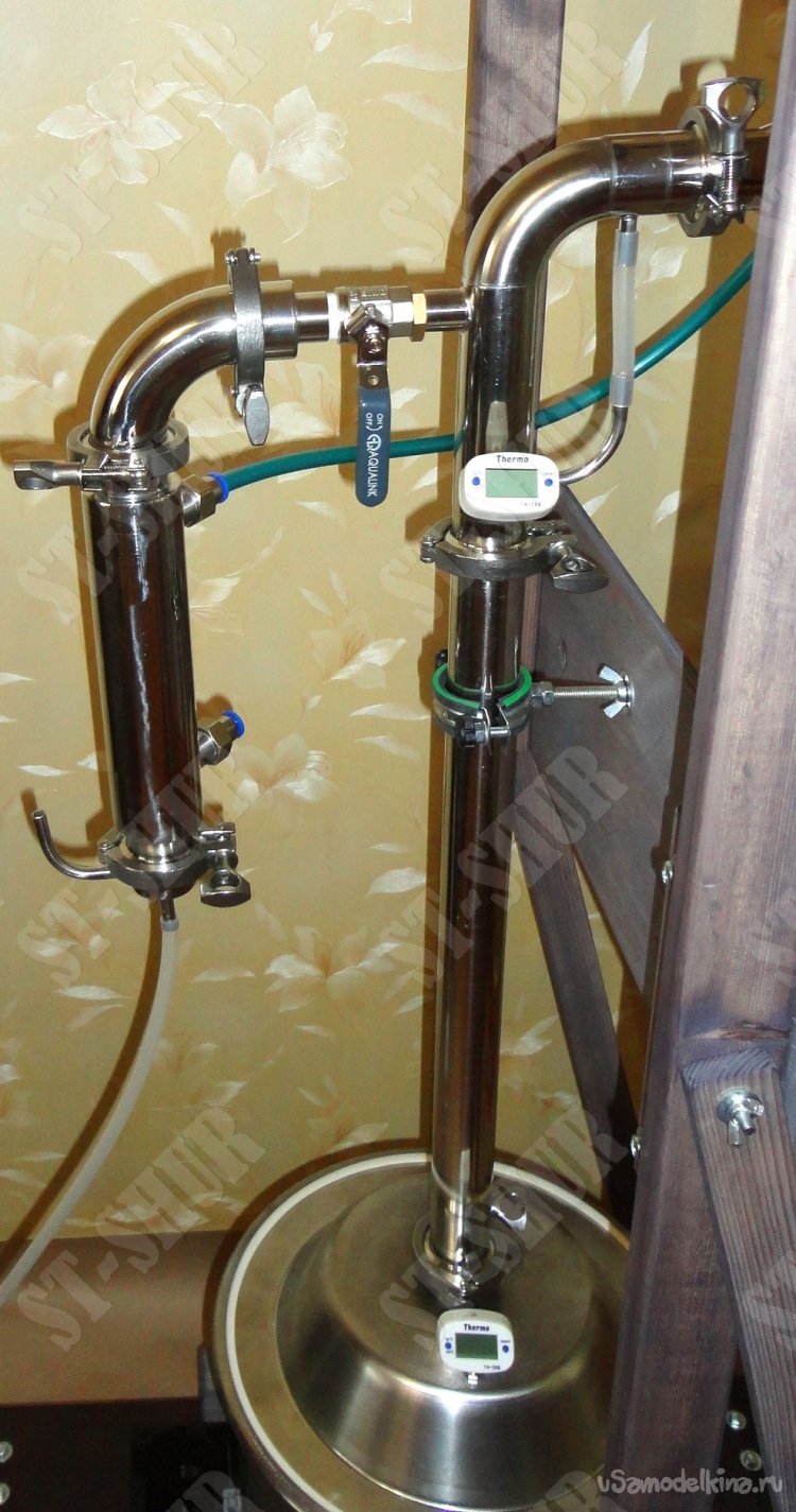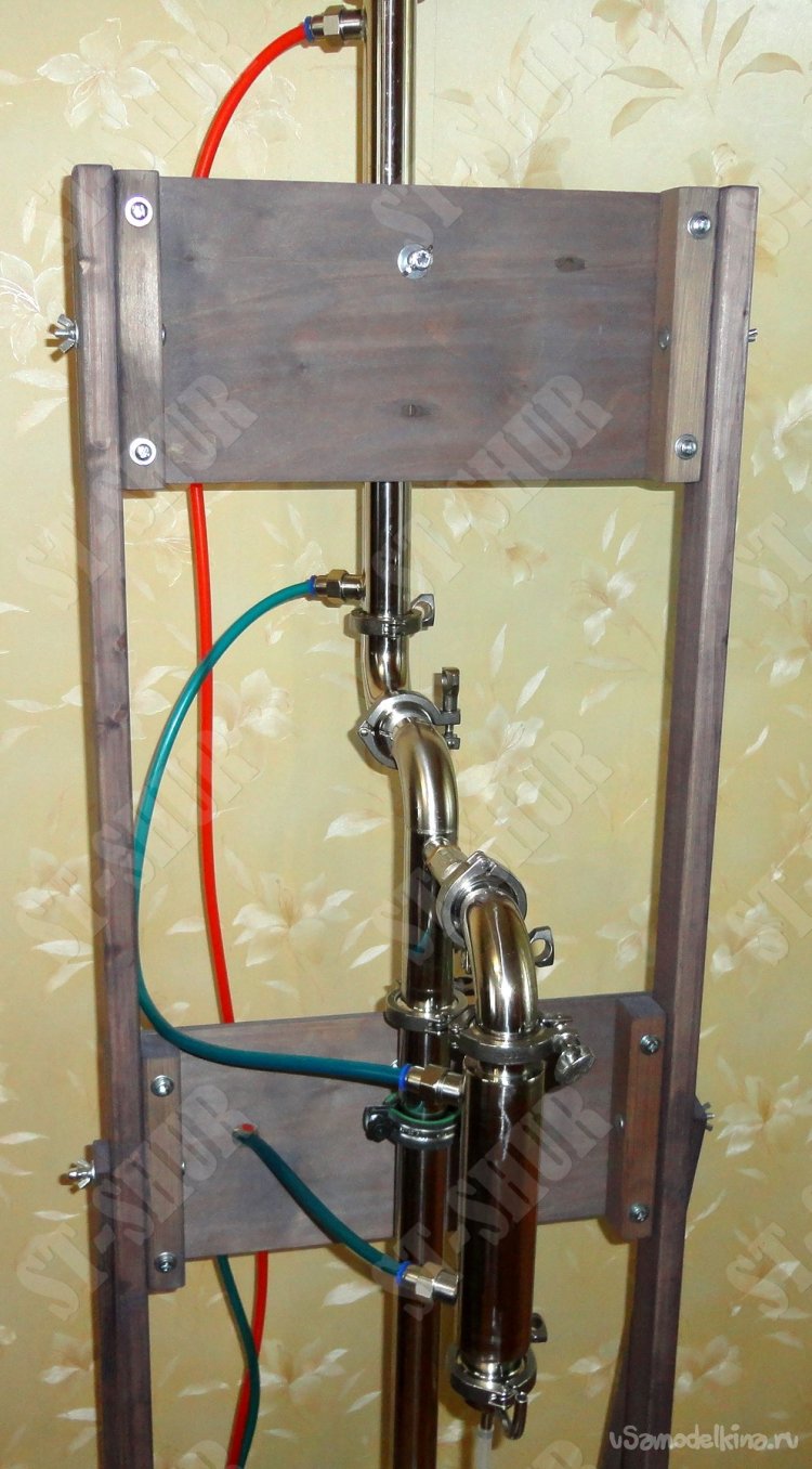 Детали стойки практически не мешают наблюдению за термометрами и трубкой перетока флегмы (зависит от варианта сборки колонны дистиллятора и расположения всей конструкции). Трубки узлов охлаждения подключаются с помощью «быстросъемов».