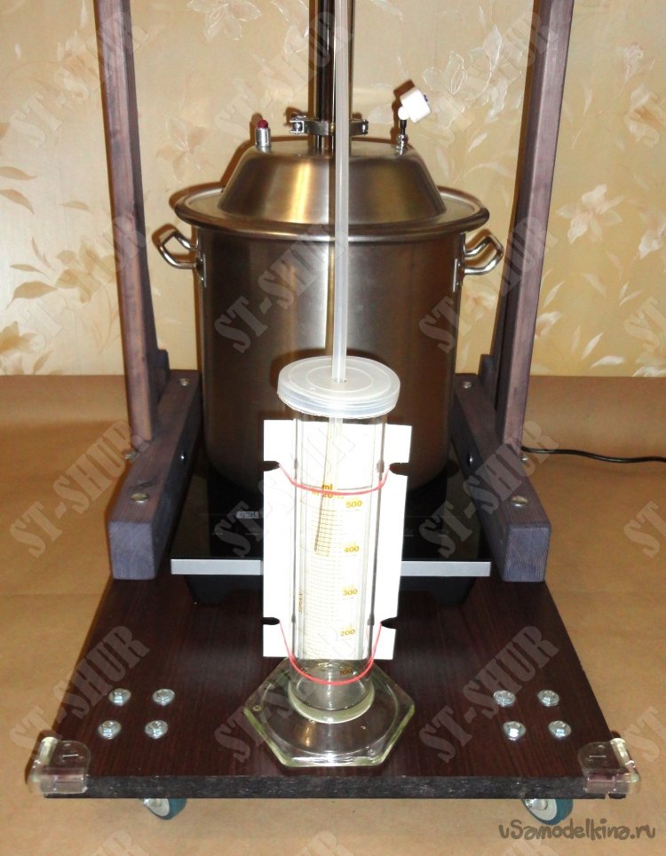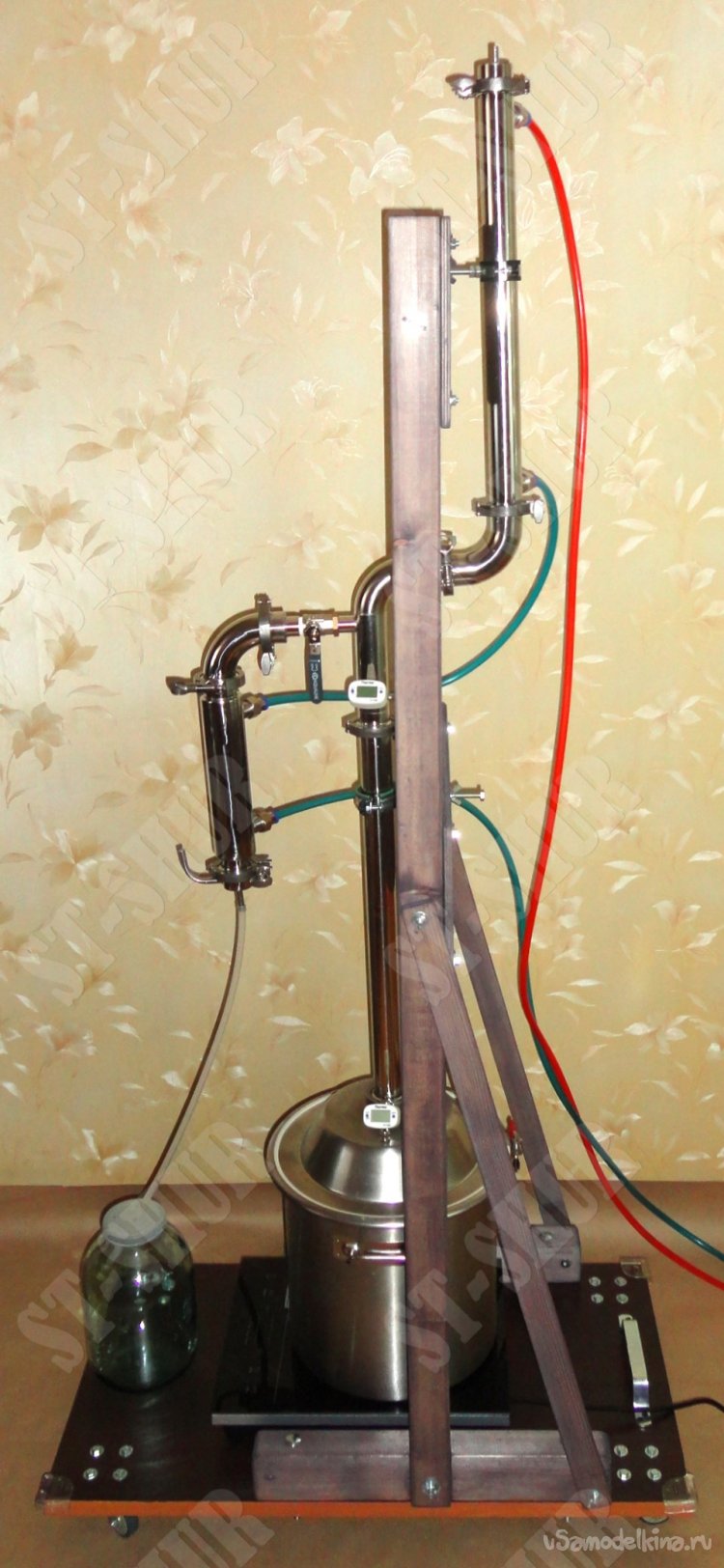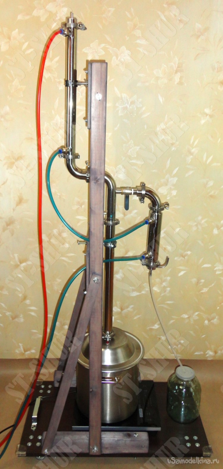 Детали стойки практически не мешают наблюдению за термометрами и трубкой перетока флегмы (зависит от варианта сборки колонны дистиллятора и расположения всей конструкции). Трубки узлов охлаждения подключаются с помощью «быстросъемов».
