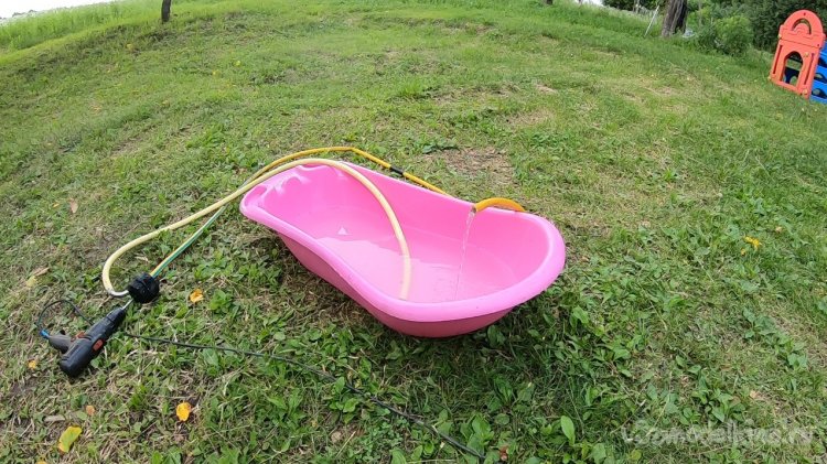 Сперва я подключил к насосу шуруповерт, он выдает 1600 оборотов на холостых, если верить инструкции. Напора на таких оборотах почти нет, и оно понятно, ведь рабочее колесо очень маленького диаметра и требует высоких оборотов.