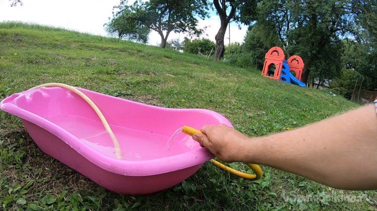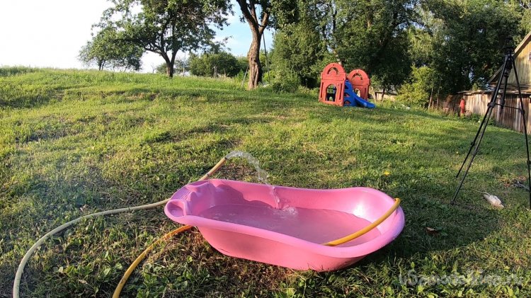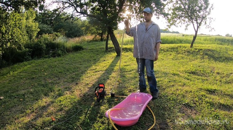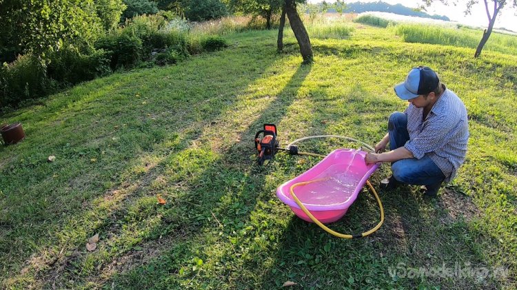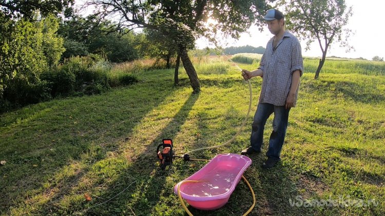 А когда я завел мотор и зафиксировал высокие обороты, напор воды поднимался выше моей головы еще метра на два, если сплющить шланг. Так что теоретически через повышающий редуктор такой насос нормально будет качать на холостых оборотах мотора.
