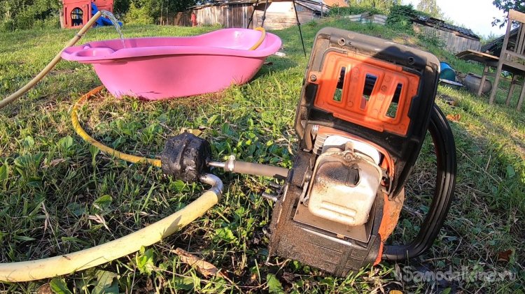 Далее я подключил насос напрямую к валу бензопилы через кусок шланга. Насос даже на холостых неплохо заработал, и появилось давление!