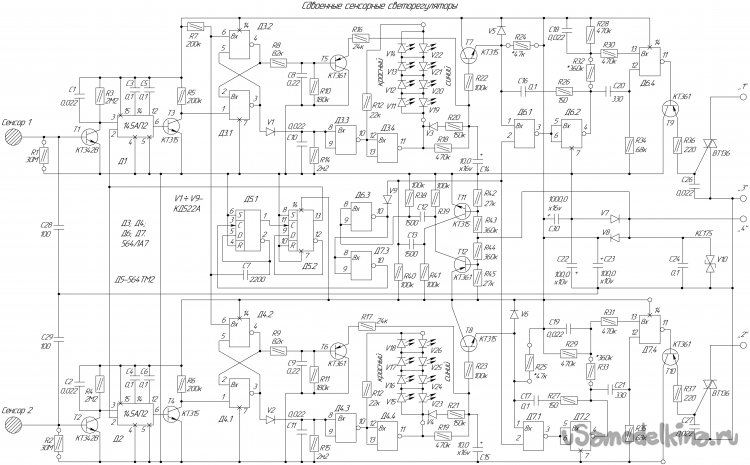 В принципиальной схеме, были внесены некоторые дополнения. Алгоритм работы, с микросхемой 145АП2, остался неизменным. При удерживании пальца на сенсоре, происходит циклическое изменение яркости светильника и в момент, когда желаемая яркость достигла своего значения, палец с сенсора необходимо убрать. Микросхема - 145АП2, запомнит это состояние и при дальнейшем включении, яркость светильника будет соответствовать установленному значению. При кратковременном касании к сенсору, яркость светильника будет постепенно увеличиваться от минимума до установленного значения, а при повторном кратковременном касании сенсора, яркость будет постепенно уменьшаться до полного отключения. Этот новый принцип работы сенсорных светорегуляторов, я дополнил по желанию заказчика.