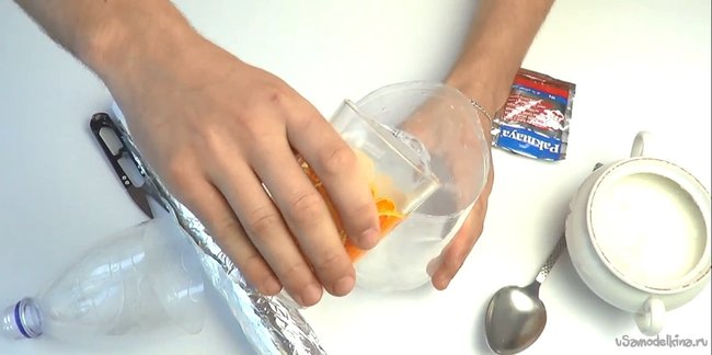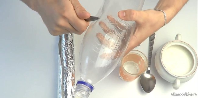 Для начала мы отрезаем верхнюю часть от пластиковой бутылки с помощью ножничек.