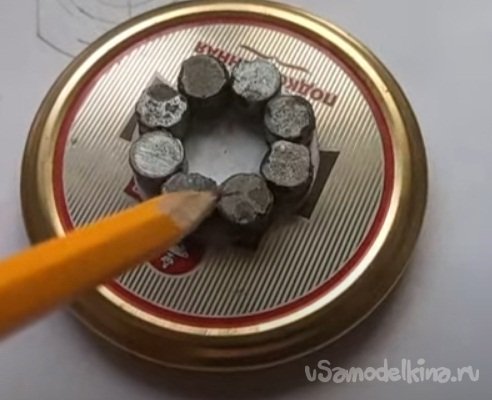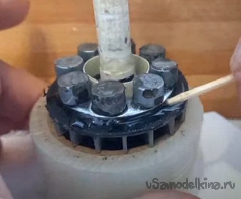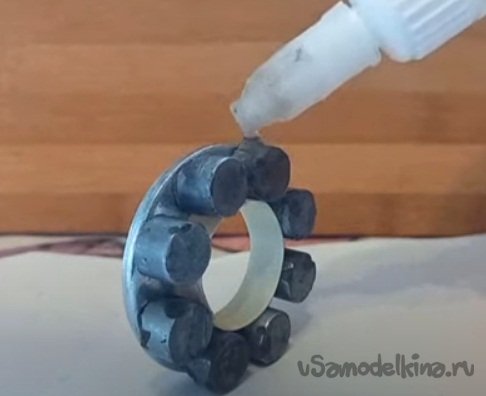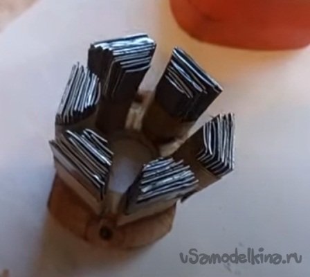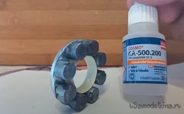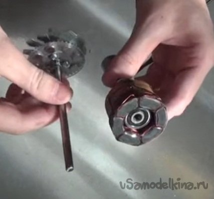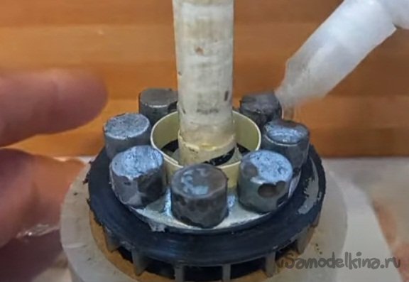 Восемь магнитов диаметром 11 мм толщиной 9 мм приклеил на подходящую по размерам металлическую шайбу, которую закрепил на крыльчатку сохраненную при разборке якоря, готовый обдув для охлаждение катушек. Если пластик не выдержит нагрузку и рассыпится, буду делать крыльчатку из металла.