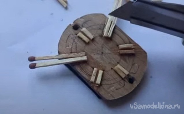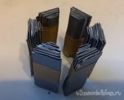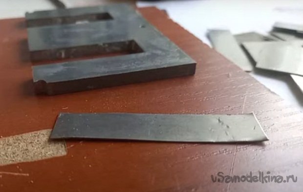 Статор делаю из оставшейся трансформаторной стали, которую брал пол года назад, там же где и корпус для моего проекта. По чертежам сердечники под катушки должны иметь форму пирамидок, поэтому заготовки под них я вырезал уменьшая по ширине согласно расчетам. Когда скомплектовал у меня получилось шесть сердечников, по тринадцать пластин в каждом, наружняя 15 мм внутренняя 6 мм, их я вклеил на деревянное основание которое подогнал под посадочный размер старого статорного магнитопровода, ну который я якобы выбросил при всех в мусор. Зазоры между сердечниками ограничил кусочками спичек, это не позволит сердечникам сместиться при креплении и сохранит геометрию.