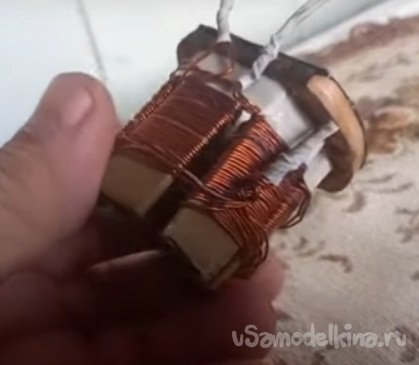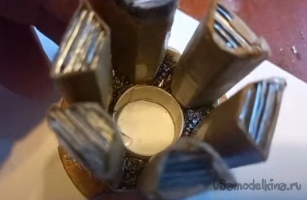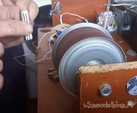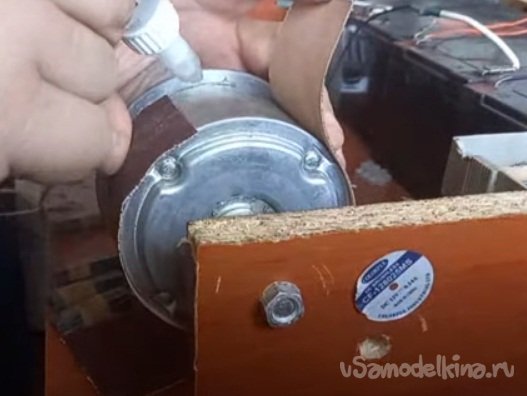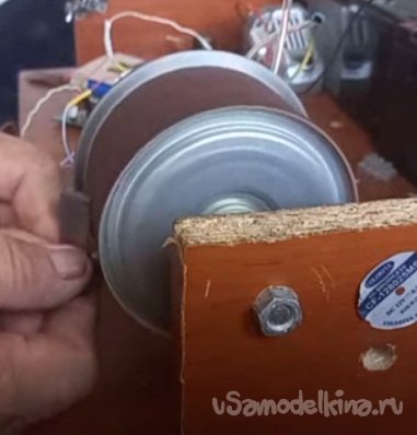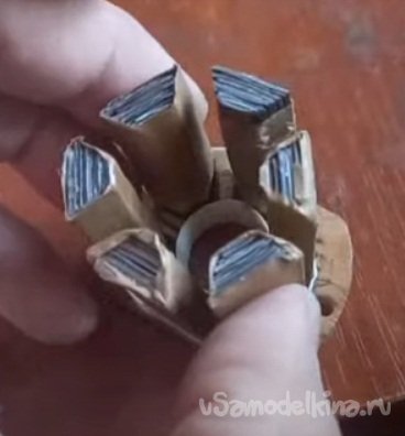 После склейки пластин в сердечники появилась потребность в обработке боковых неровностей. В этом мне помог бесколлекторный моторчик о котором я рассказывал ранее, он был создан для будущего гриндера. Обклеив вращающийся статор наждачной бумагой получил точильный круг и без труда ободрал заготовки. Потом металл обвернул бумагой и вклеил сердечники в подготовленную деревянную пластину.