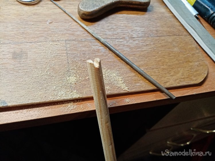 На комле будущей стелы протачиваю паз для тетивы. Использую надфиль подходящего размера.